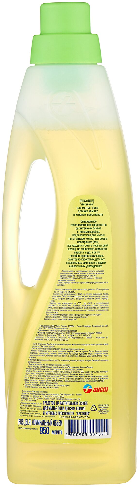 Специальное гипоаллергенное средство на растительной основе с ионами серебра "АИСТЕНОК" для мытья пола детских комнат и игровых пространств. Обеспечивает и поддерживает чистоту в комнате, выполняя одно из важнейших условий сохранения здоровья ребенка-гигиеническую чистоту. Аистенок там, где дети!