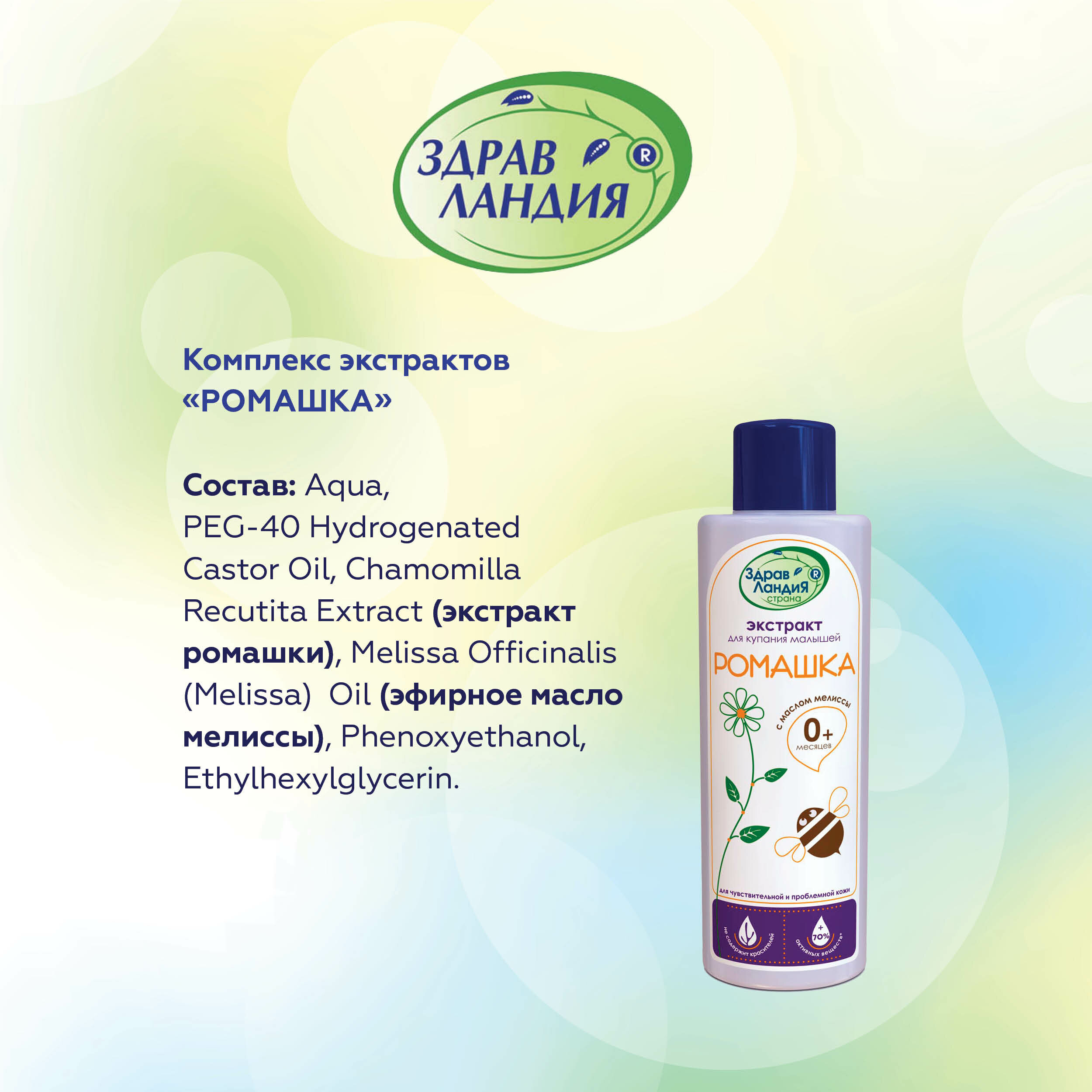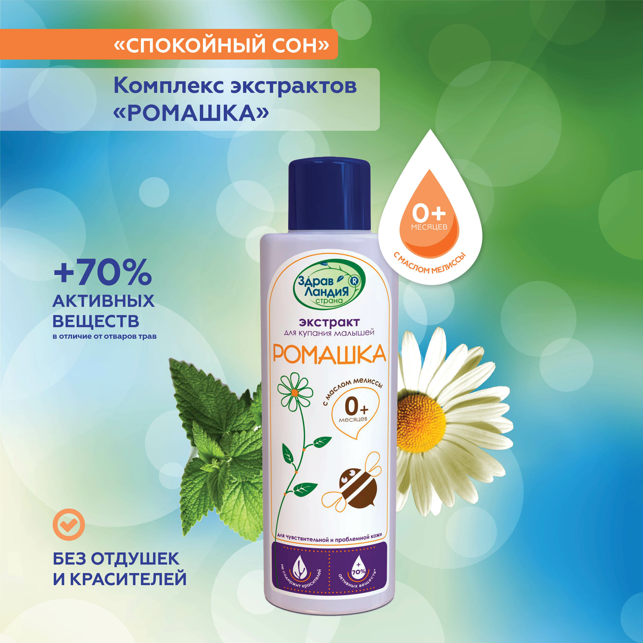 Экстракт ромашки с маслом мелиссы успокаивает. Обладает противовоспалительным и местным обезболивающим действиями, снимает раздражение и шелушение кожи, естественно увлажняет и успокаивает чувствительную кожу, масло мелиссы оказывает противовирусное и иммуностимулирующее действия, снимает нервное напряжение. Прошел клинические испытания.