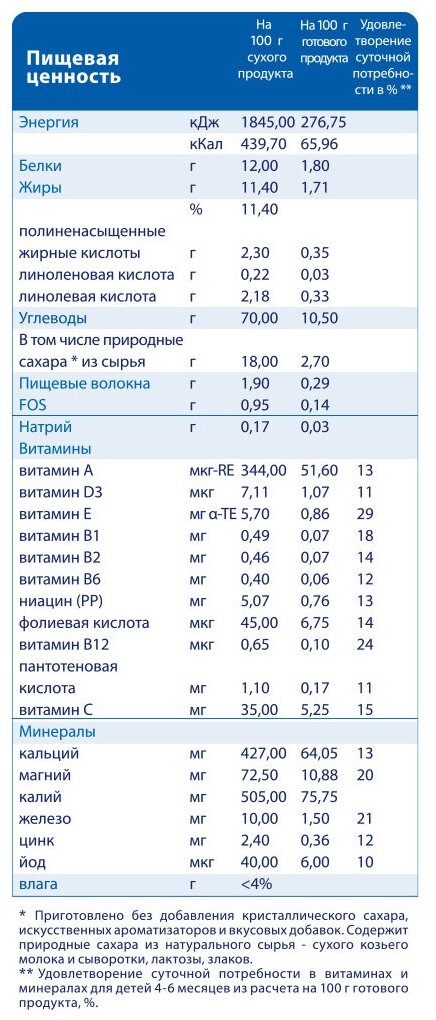 | Состав | рисовая мука, гидролизованная рисовая мука, адаптированная молочная смесь Kabrita на основе натурального козьего молока (обезжиренное сухое козье молоко, растительные масла (комплекс Digest X - 1,3-диолеол 2-пальмитиол триглицерид рапсовое, пальмовое, подсолнечное масла), соевый лецитин, лактоза, концентрат сывороточных белков козьего молока, гидроксид калия, хлорид магния, L-таурин, холина хлорид), гидролизованный кукурузный крахмал, пребиотик фруктоолигосахарид (FOS – инулин), минеральные вещества, витамины |