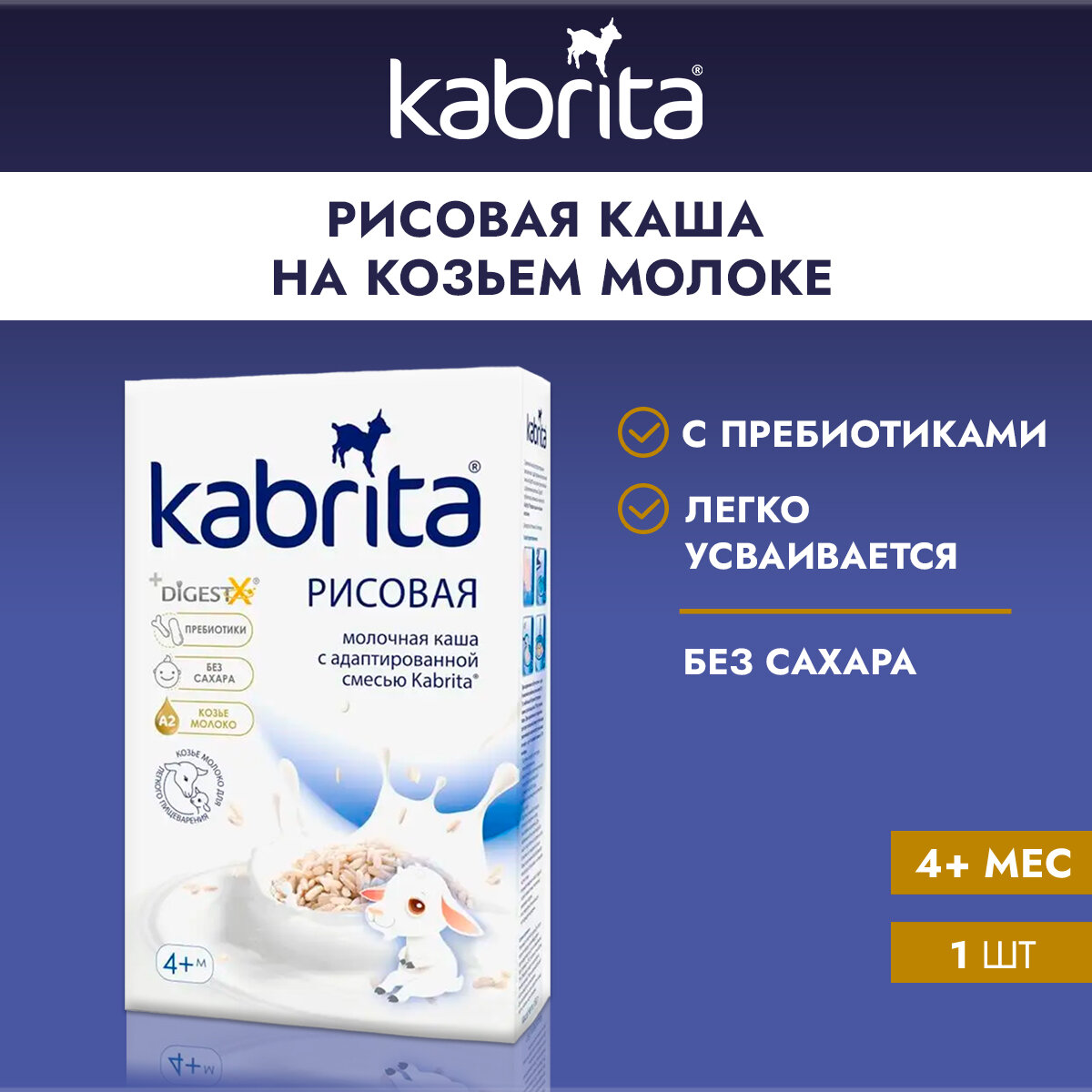 - Молочная основа каш Kabrita - адаптированная смесь Kabrita - способствует щадящему переходу к прикорму и естественному облегчению пищеварения.