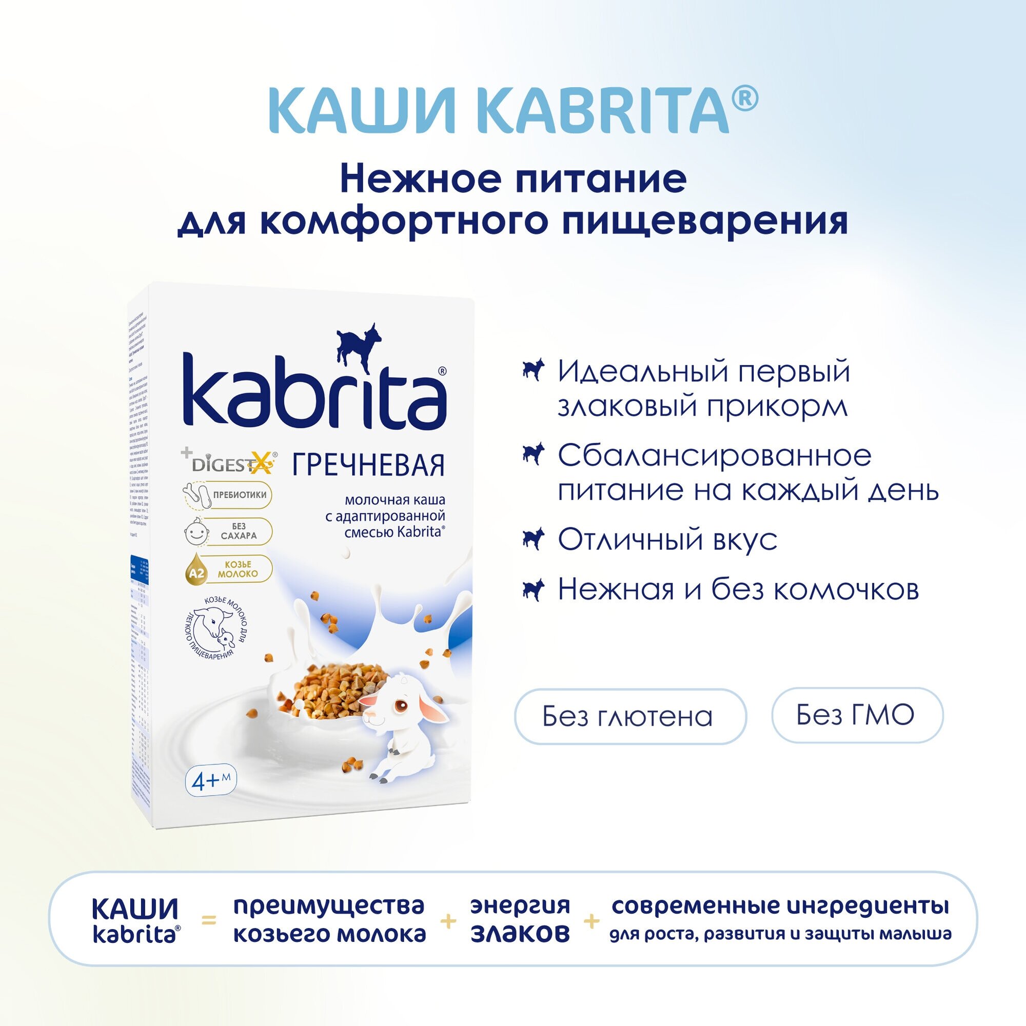 - Молочная основа каш Kabrita - адаптированная смесь Kabrita - способствует щадящему переходу к прикорму и естественному облегчению пищеварения.