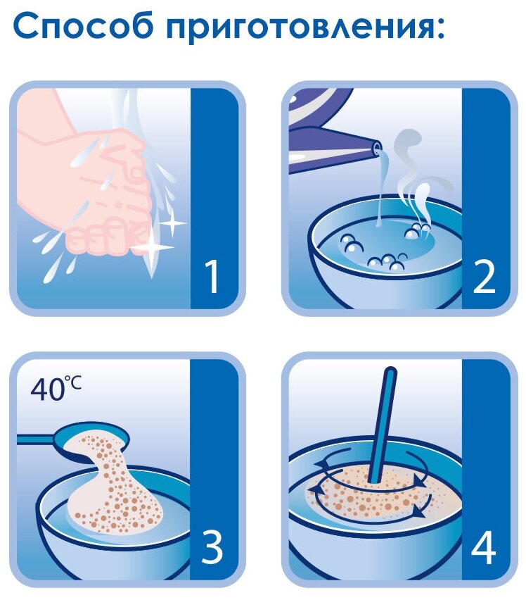 Способ приготовления: При кормлении из бутылочки - для 4-х месячного ребенка возьмите 30 г (3 с небольшой горкой столовые ложки сухой каши) на 170 мл теплой воды. При кормлении из тарелочки для приготовления более густой каши увеличивайте количество сухой каши по вкусу – до 4 столовых ложек на 170 мл воды. Налейте в чистую тарелочку указанное количество прокипяченной и остуженной до 40°C воды и добавьте рекомендуемое количество сухой каши. Тщательно размешайте кашу до полного растворения и сразу приступайте к кормлению. При кормлении из бутылочки перелейте кашу в подготовленную заранее чистую бутылочку со специальной соской. Перед кормлением всегда проверяйте температуру готовой каши, используйте чистую ложку. Начинайте введение нового продукта с одной чайной ложки, постепенно увеличивая порцию.