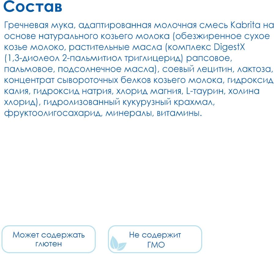 Состав: Гречневая мука, адаптированная молочная смесь Kabrita на основе натурального козьего молока (обезжиренное сухое козье молоко, растительные масла (комплекс Digest X - 1,3-диолеол 2-пальмитиол триглицерид рапсовое, пальмовое, подсолнечное масла), соевый лецитин, лактоза, концентрат сывороточных белков козьего молока, гидроксид калия, хлорид магния, L-таурин, холина хлорид), гидролизованный кукурузный крахмал, пребиотик фруктоолигосахарид (FOS - инулин), минеральные вещества, витамины. Содержит молоко.