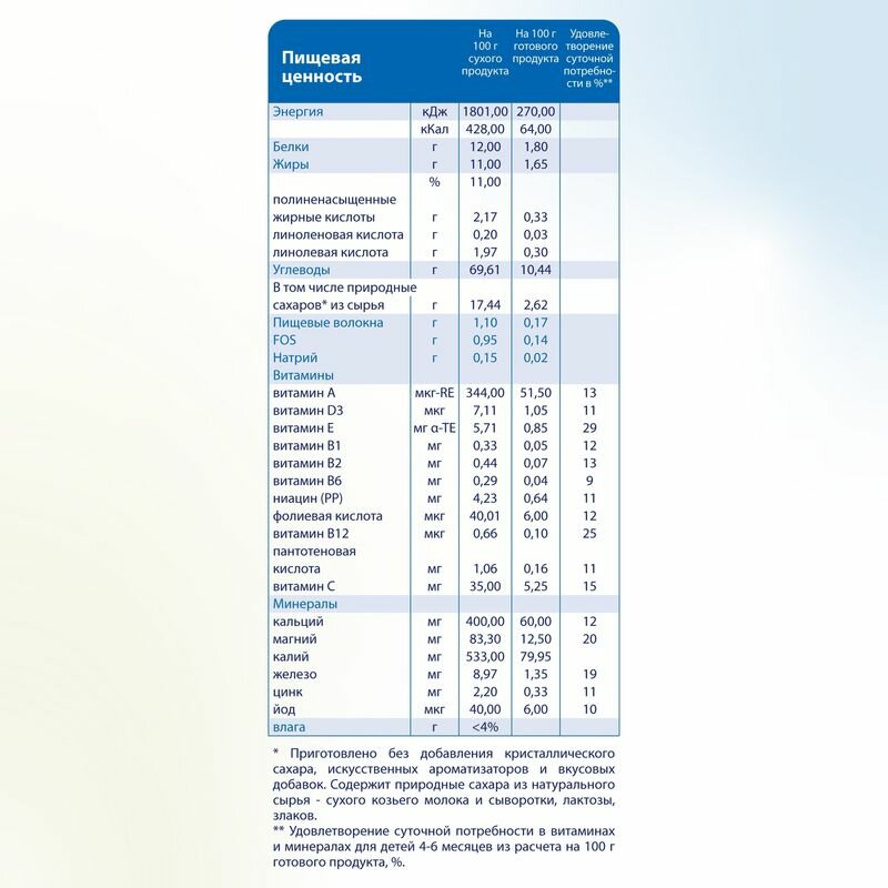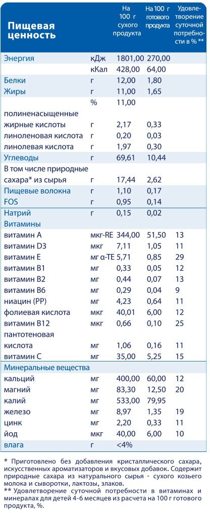 | Состав | гречневая мука, адаптированная молочная смесь Kabrita на основе натурального козьего молока (обезжиренное сухое козье молоко, растительные масла (комплекс Digest X - 1,3-диолеол 2-пальмитиол триглицерид рапсовое, пальмовое, подсолнечное масла), соевыйлецитин, лактоза, концентрат сывороточных белков козьего молока, гидроксид калия, хлорид магния, L-таурин, холина хлорид), гидролизованный кукурузный крахмал, пребиотик фруктоолигосахарид (FOS - инулин), минеральные вещества, витамины |