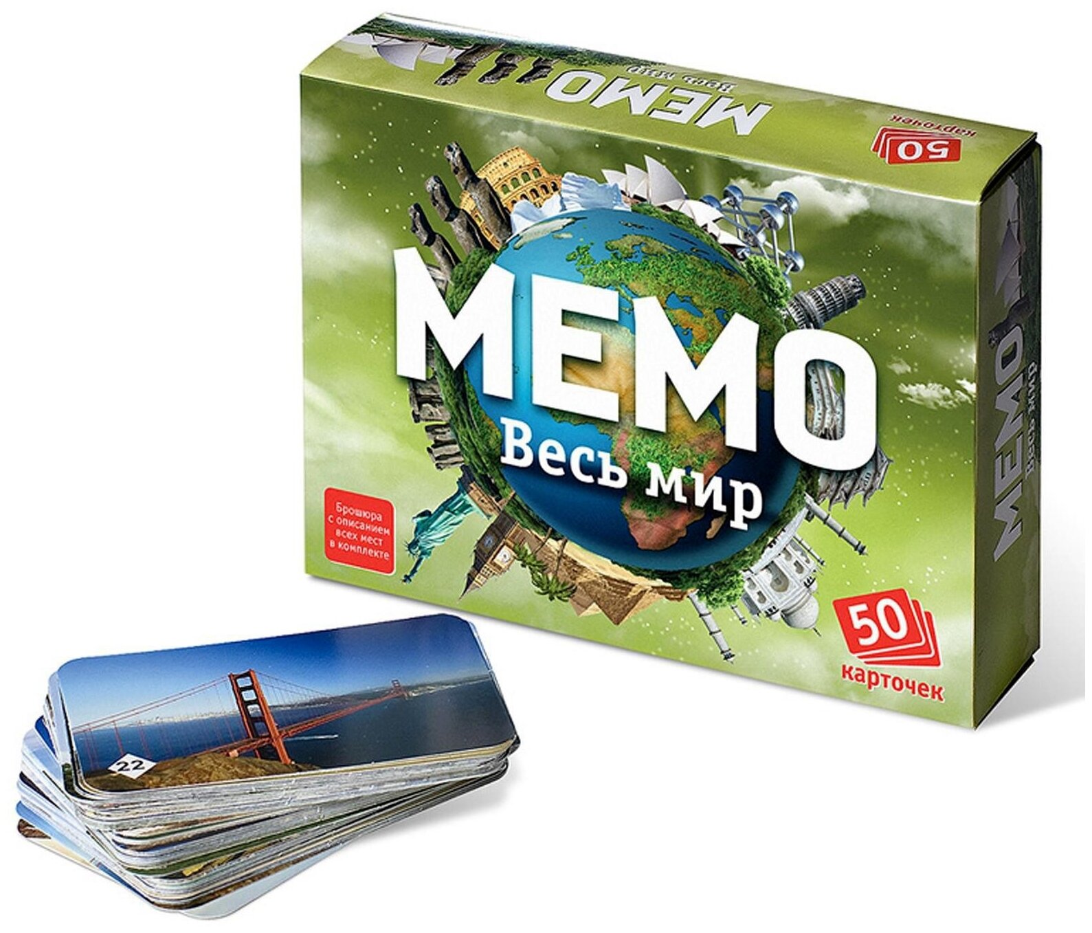 Также в комплекте вы найдёте буклет с описанием всех мест, изображённых на карточках. Наверняка, вы узнаете много нового. А если у вас есть карта (мира, России, Санкт-Петербурга), то вы можете усложнить игру, добавив в неё задание, где ребёнку предлагается расположить карточку в соответствии с её реальным местоположением на карте. Ведь в России и мире есть столько удивительных мест, где действительно стоит побывать! Играйте в «Мемо» и путешествуйте с удовольствием! И, наконец, «Мемо» — это всегда хороший подарок, который одинаково подходит как для мальчиков, так и для девочек.