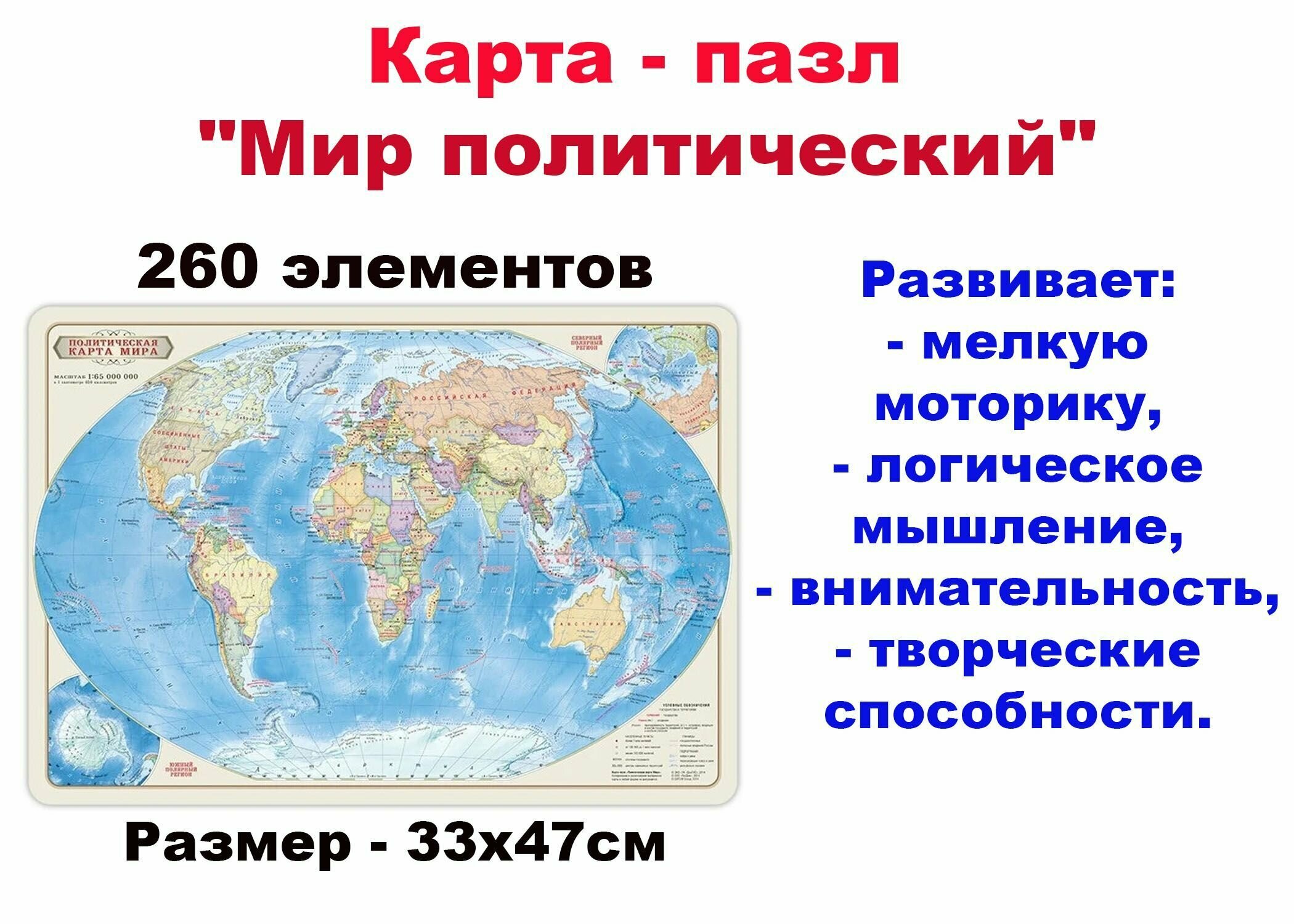 Ваш ребенок в процессе игры с большим интересом изучит политико-административное устройство мира и познакомится со столицами государств. Пазлы с картой мира позволяют узнать, какие океаны омывают материки и острова. Это отличный метод познакомиться с особенностями географии уже с малого возраста. Играя, ребенок развивает воображение, пространственное мышление, внимание, память и способность анализировать! Познавайте окружающий мир вместе с ребенком, собирая карты-пазл!
