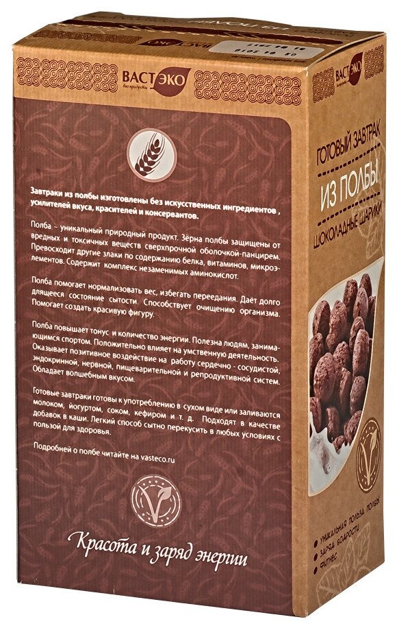 Способ приготовления: Готовый завтрак из полбы. Шоколадные шарики заливаются молоком, йогуртом, соком, кефиром.