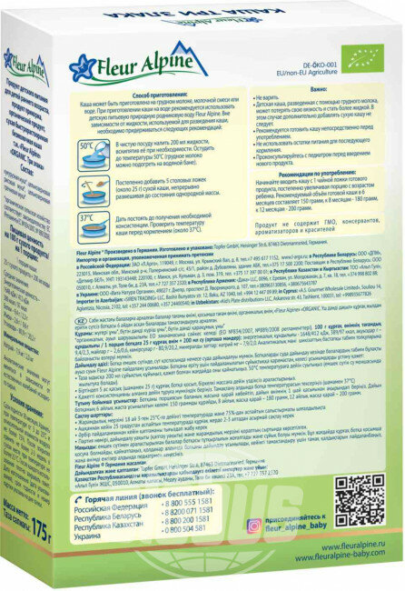 | Способ приготовления | В чистую посуду налить 200 мл жидкости, предварительно остудив ее до температуры 50°С. Постепенно добавить 5-6 столовых ложек (около 25 г) сухой каши, непрерывно размешивая до состояния однородной массы. Дать постоять до получения необходимой консистенции. Проверить температуру каши перед кормлением (около 37°С). Каша может быть приготовлена на грудном молоке, молочной смеси или воде. Начинайте вводить кашу с 1 чайной ложки готового продукта, постепенно увеличивая порцию с возрастом ребенка. Рекомендуемый объем готовой каши в 4-6 месяцев составляет 150 г, к 8 месяцам - 180 г, к 12 месяцам – 200 г. Не используйте остатки каши для последующего кормления. |