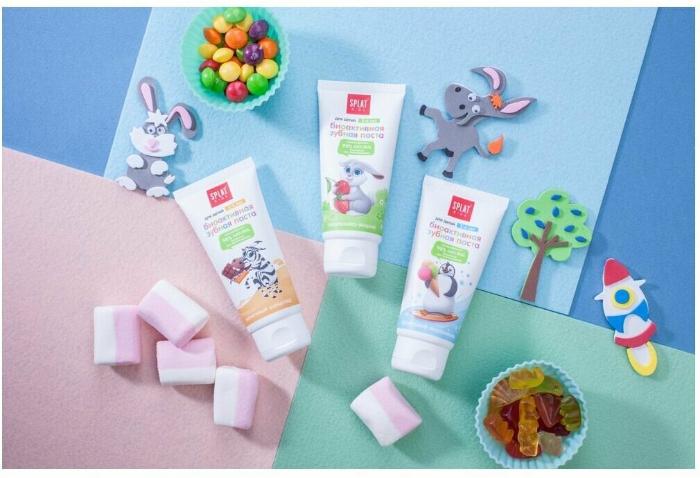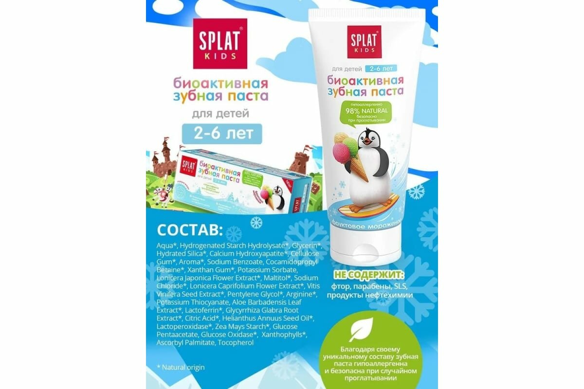 SPLAT KIDS НЕ СОДЕРЖАТ МЯТУ, ФТОР, ПАРАБЕНЫ, SLS, СИНТЕТИЧЕСКИЕ АНТИСЕПТИКИ, ПРОДУКТЫ НЕФТЕХИМИИ, АЛЛЕРГЕНЫ, КРАСИТЕЛИ И КОНСЕРВАНТЫ. 99,3% NATURAL. БЕЗОПАСНЫ ПРИ СЛУЧАЙНОМ ПРОГЛАТЫВАНИИ. ГИПОАЛЛЕРГЕННО. 100% БЕЗАБРАЗИВНЫ