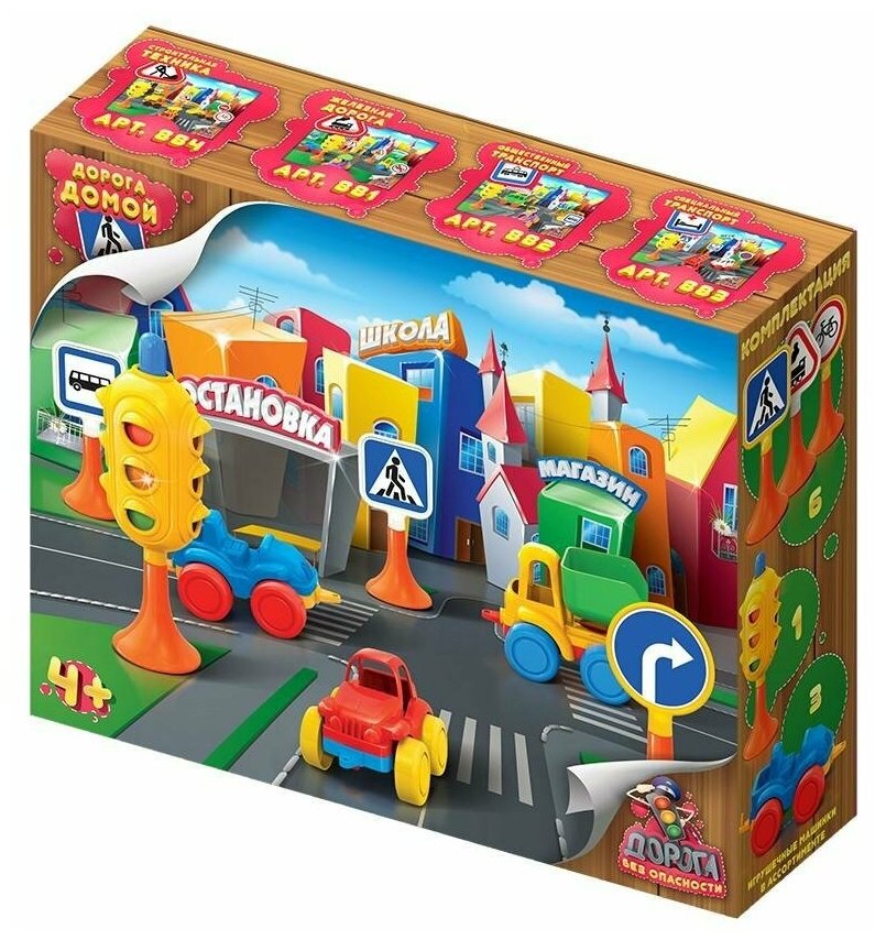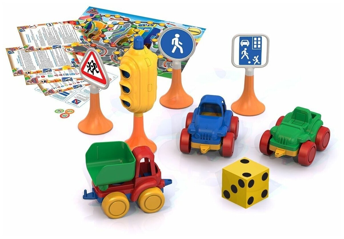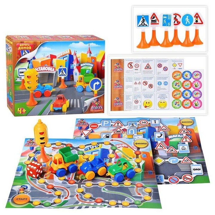 | Комплектация | 2 игровых поля, 36 карточек, светофор, 6 дорожных знаков, 3 машинки, 6 фишек, кубик, наклейки, правила игры |
