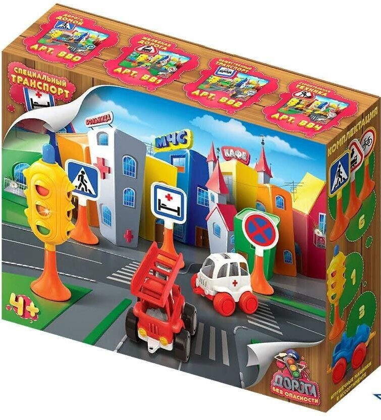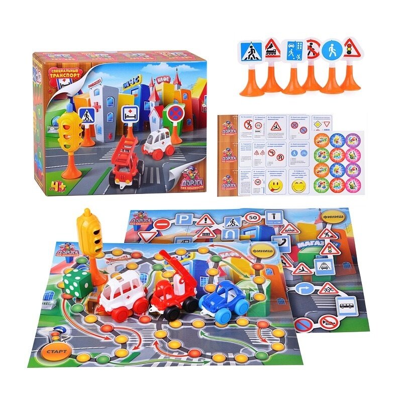 Игра "Специальный транспорт" из серии ДОРОГА БЕЗ ОПАСНОСТИ предназначена для детей в возрасте 4-10 лет. Она включает в себя настольную игру с двумя полями разного уровня сложности, описание дорожных знаков и правила безопасного поведения детей вблизи проезжей части, которые помогут взрослым (родителям, воспитателям, педагогам) обучить ребенка правильно вести себя рядом с дорогой. Также в комплекте Вы найдете игрушки: машинки и знаки, которые помогут ребенку в игровой форме закрепить важную информацию.
