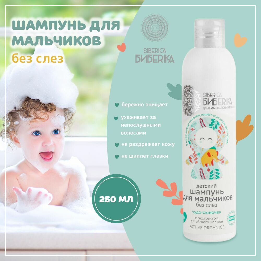 Siberica БИБЕRIКА Шампунь без слез для мальчиков Чудо-сыночек, 250 мл. Детский шампунь без слез бережно очищает и ухаживает за непослушными волосами, не раздражает кожу и не щиплет глазки. Натуральные компоненты сибирских растений питают и насыщают волосы полезными веществами.