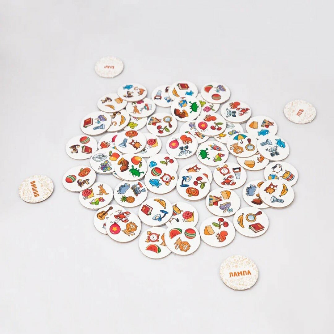 В игровом комплекте 96 фишек-жетонов. С одной стороны фишки — три ярких картинки, с другой написано слово. Фишки разделены цветом на два игровых комплекта: в