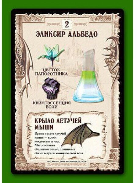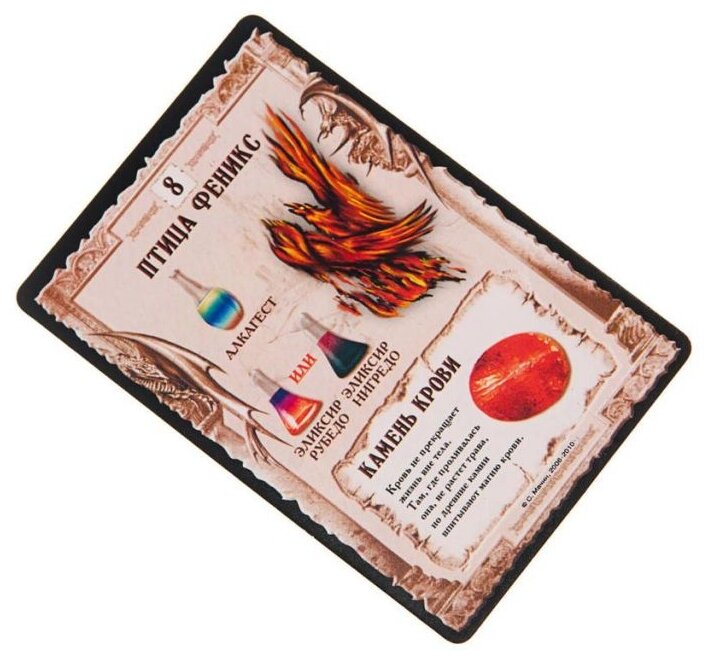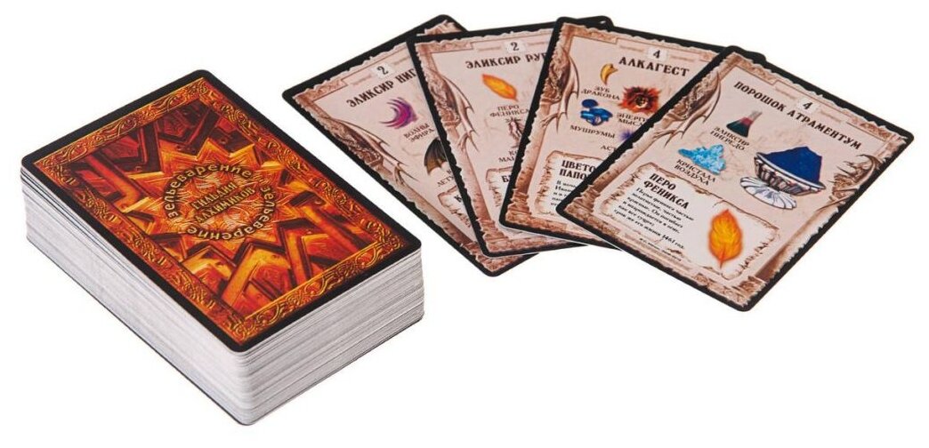 Обратите внимание: Зельеварение. Гильдия Алхимиков – не самостоятельная игра, а дополнение, и без базовой колоды Зельеварения посидеть за ней не получится.