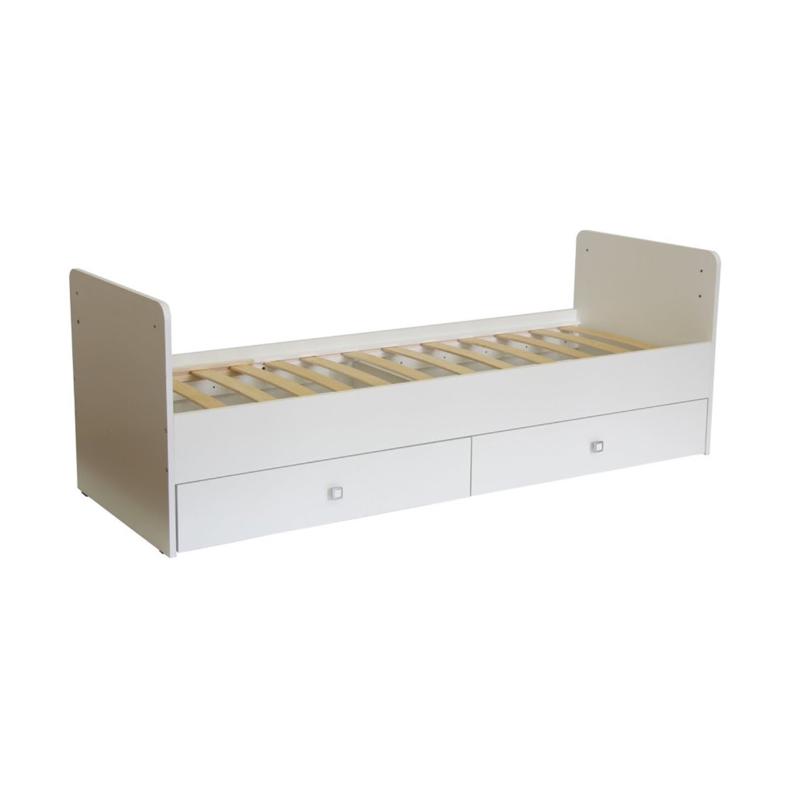 Детская кроватка трансформируется в подростковую кровать и тумбу. Имеет пять вместительных ящиков.