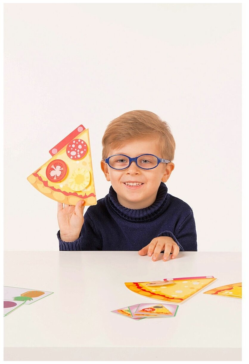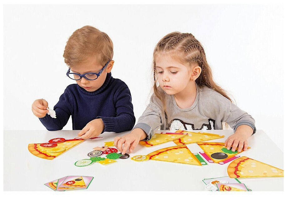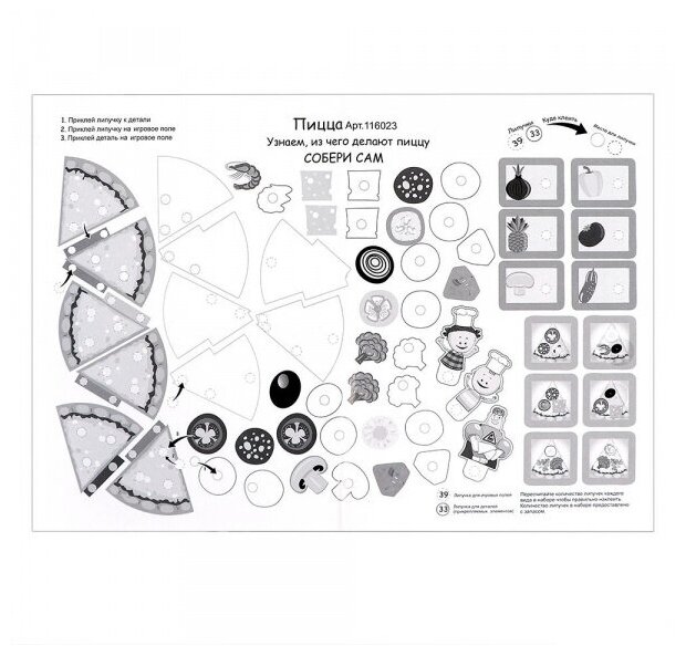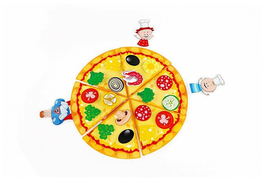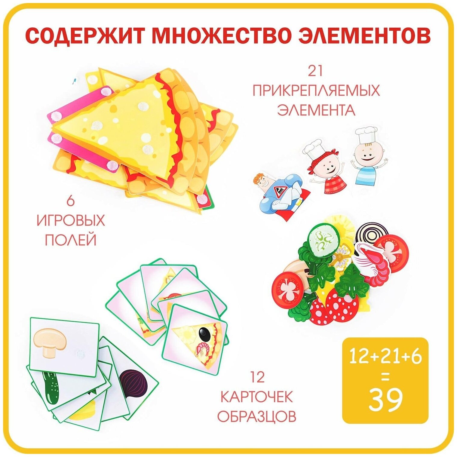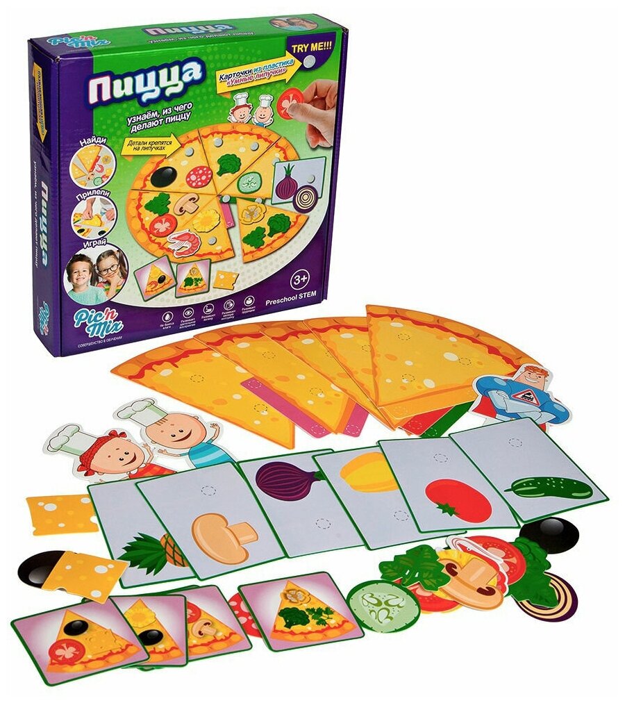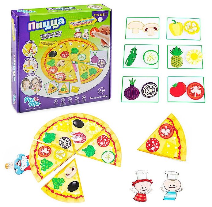 Обучающая игра -пазл липучка из серии Аркадий Паровозов состоит из 6 игровых полей, в виде кусков пиццы. Прикрепляя на поля различные инредиенты, игрок запоминает не только внешний вид, но также и названия различных продуктов, которые используются для приготовления Пиццы. В процессе игры ребенок тренирует логику, память, расширяет свой словарный запас и кругозор.