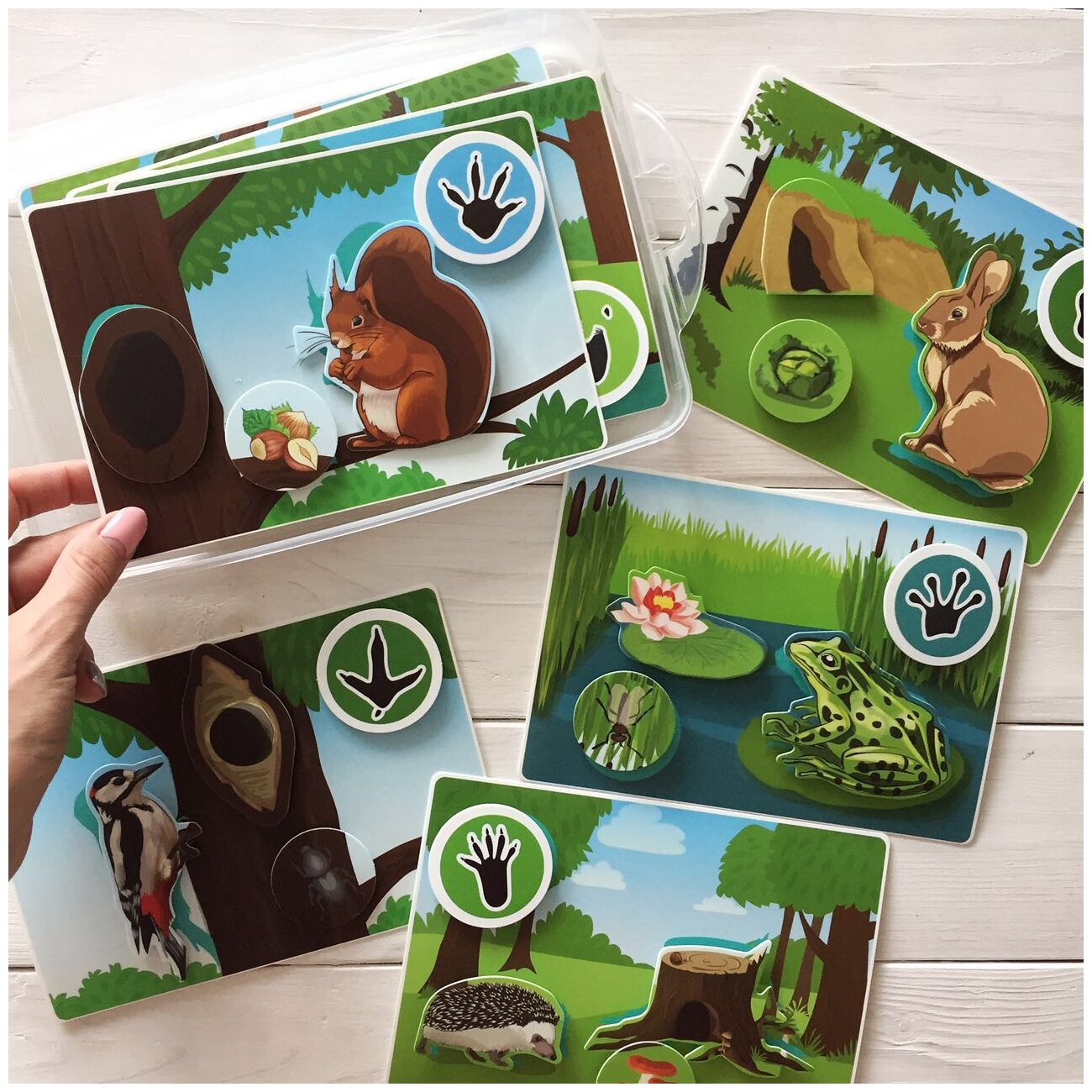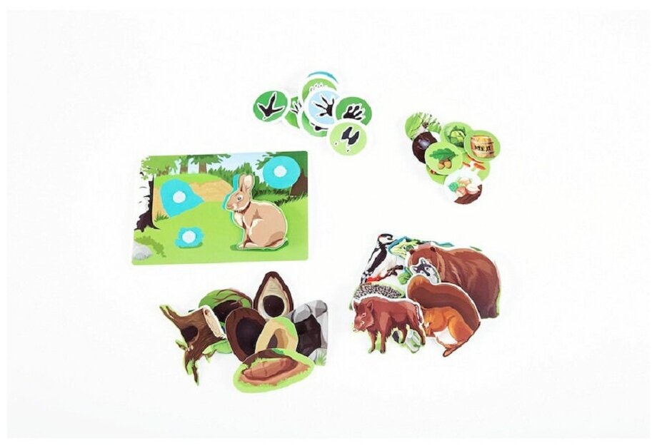 Обучающая игра пазл-липучка состоит из 8 игровых полей, заполняя которые, ребенок изучает названия диких животных, а также их повадки.