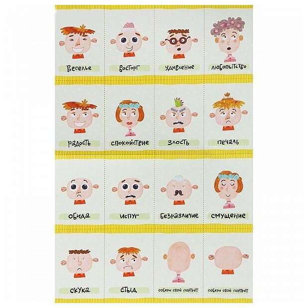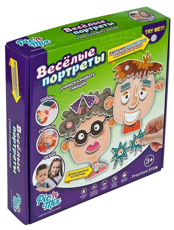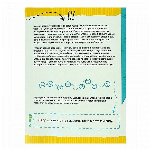 Игра представляет собой набор лиц-шаблонов, на которые можно накладывать разные носы, глаза, губы. Огромное количество комбинаций позволяет передать самые разные эмоции. В игру можно играть как дома, так и в детском саду. Главная задача этой игры — научить ребёнка видеть и узнавать разные чувства и их оттенки.