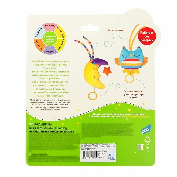 Развивающая игрушка-подвеска от Fancy Baby — яркая и милая мягкая игрушка, которая поможет не только весело провести время, но и получить полезные навыки. Развивает у малыша мелкую моторику рук, визуальное восприятие и музыкальный слух. Потяните кольцо и услышите приятную музыку. Сделана из безопасных для детей материалов. Товар сертифицирован.
