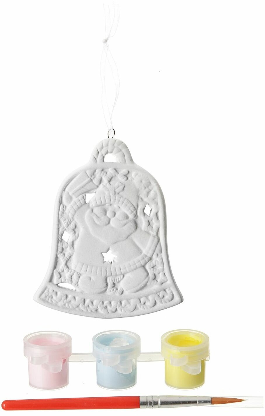 - В комплекте есть всё необходимое для росписи керамической фигурки: сама фигурка и 3 разноцветные краски с кисточкой.