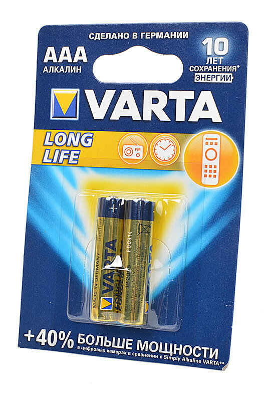 Щелочные батарейки AAА Varta Long Life LR03 идеально подходят для приборов с невысоким и постоянным энергопотреблением, таких как: пульт управления, часы, радио, микрофоны, фонари и т.п.