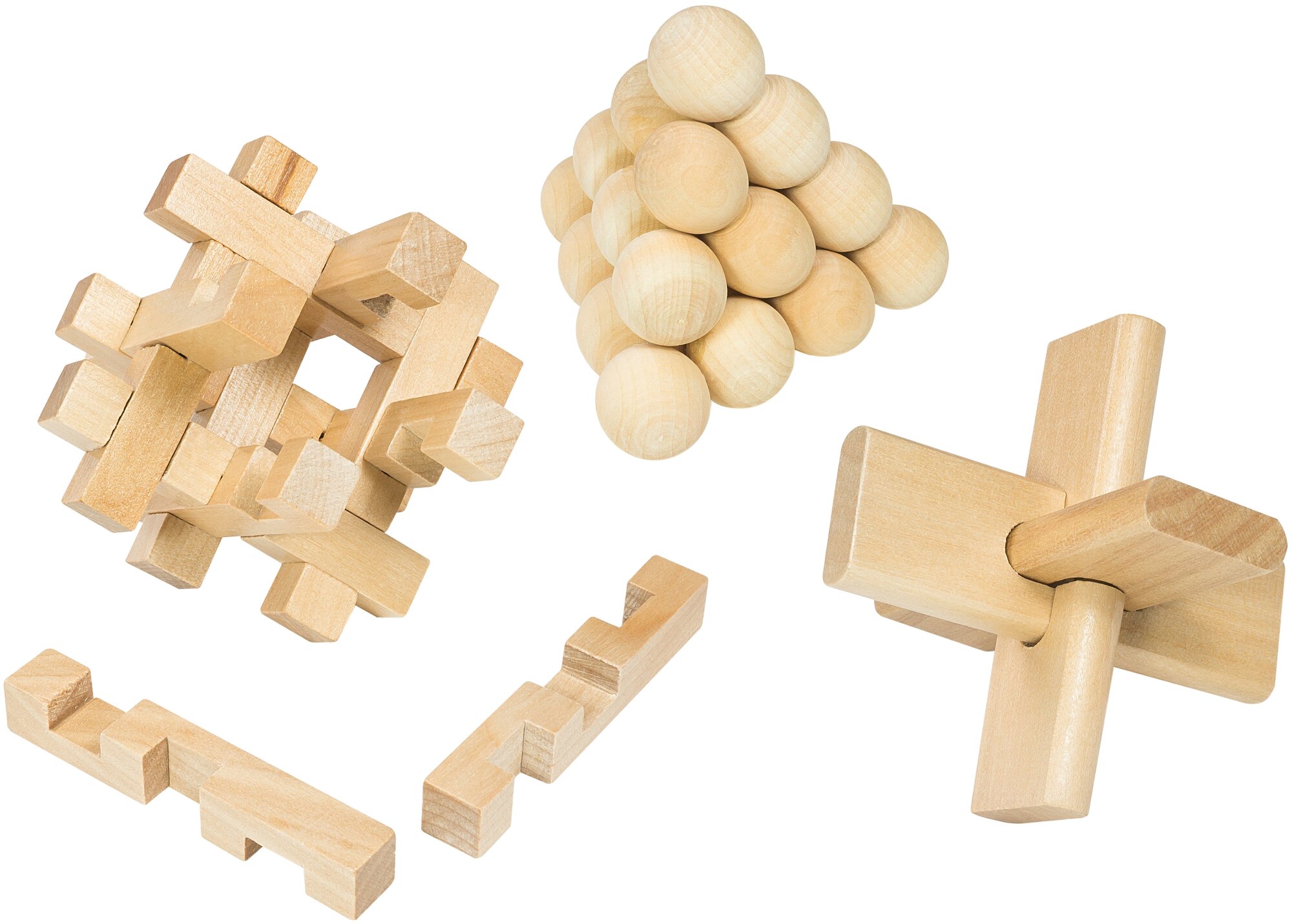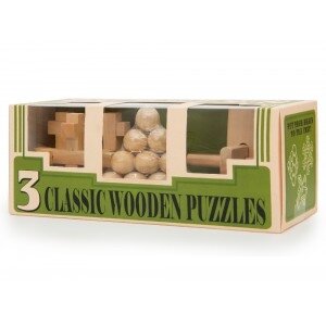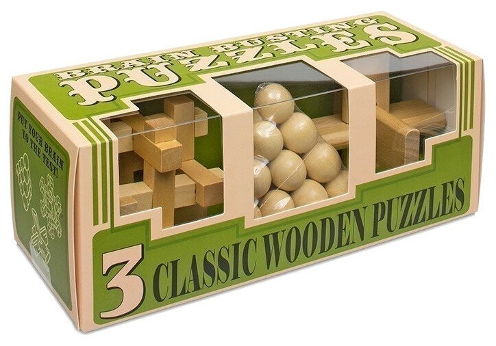 - Состав игры: 3 деревянных головоломки, коробочка.