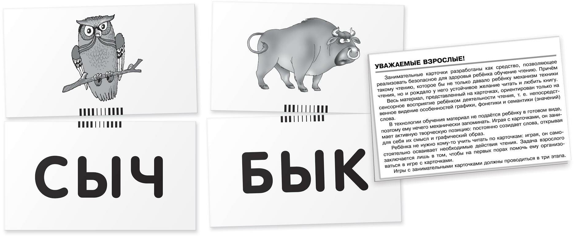 Набор карточек с картинками из серии "Занимательные карточки" входит в состав комплекта по обучению ребенка грамоте. Общее количество карточек в комплекте обеспечивает становление у ребёнка полноценной техники первоначального чтения. Играя с карточками - составляя слова, ребёнок учится читать, запоминает графический образ слова. В данный набор входят 48 карточек, из которых можно составить 16 картинок. Если правильно собрать картинку, получится односложное слово. В игре используется как лицевая сторона карточки, так и оборотная, что позволяет повысить эффективность обучения чтению. Пособие предназначено для занятий с детьми дошкольного и младшего школьного возраста. Используется на первом этапе обучения - чтение односложных слов с твердыми согласными. В комплекте подробная инструкция для родителей.