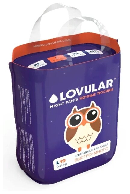 Подгузники-трусики Lovular ночные L предназначены для малышей весом 9-14 кг, 19 штук. Ночные трусики-подгузники LOVULAR повышенной впитываемости подарят малышу спокойный продолжительный сон. Мягкая эластичная 3D-манжетка плотно облегает животик малыша, обеспечивая свободное дыхание и уверенную фиксацию на теле. Равномерное распределение мельчайших гранул абсорбента осуществляют быстрое впитывание жидкости при любом положении ребенка во время сна: на боку, на спинке или на животе.