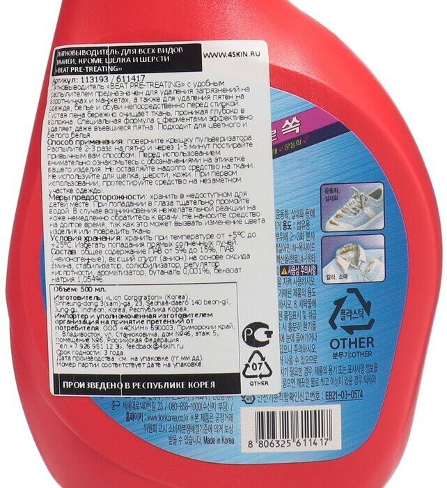 Средство CJ Lion Beat чистящее для обработки ткани перед стиркой спрей 500 мл (8806325-611417)