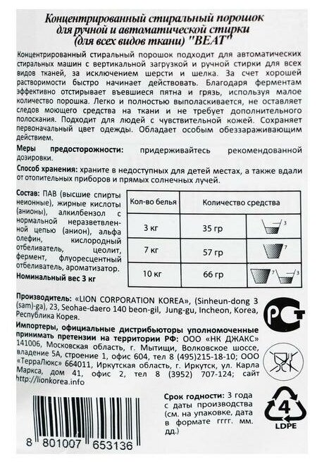 Порошок стиральный CJ Lion Beat для ручной и автоматической стирки 3 кг (8801007-653136)
