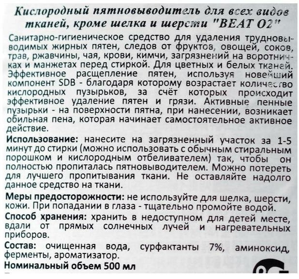 Использование: нанесите на загрязненный участок за 1-5 минут до стирки (можно использовать с обычным стиральным порошком и кислородным отбеливателем) так, что бы он пропиталась пятновыводителем. Можно потереть для лучшего пропитывания ткани. Не оставляйте надолго данное средство на ткани. Не используйте для шелка, шерсти, кожи.