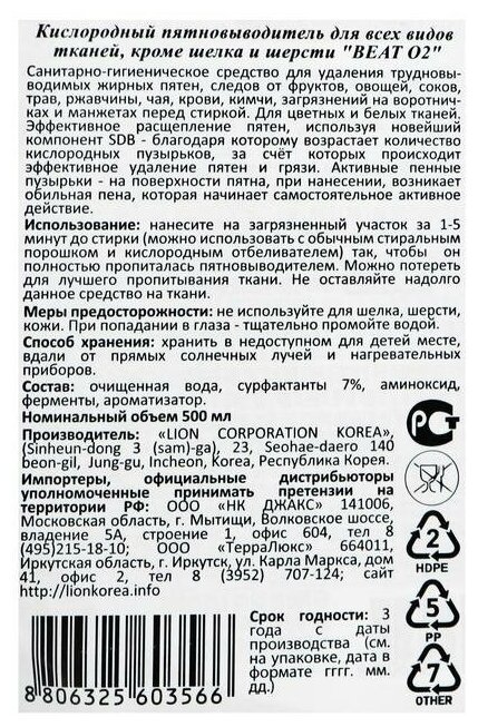 На сегодняшний день товар «Пятновыводитель CJ Lion супер концентрированный кислородный Beat O2 спрей 500 мл (8806325-603566)» можно купить с кешбеком в 1 магазине: Яндекс.Маркет