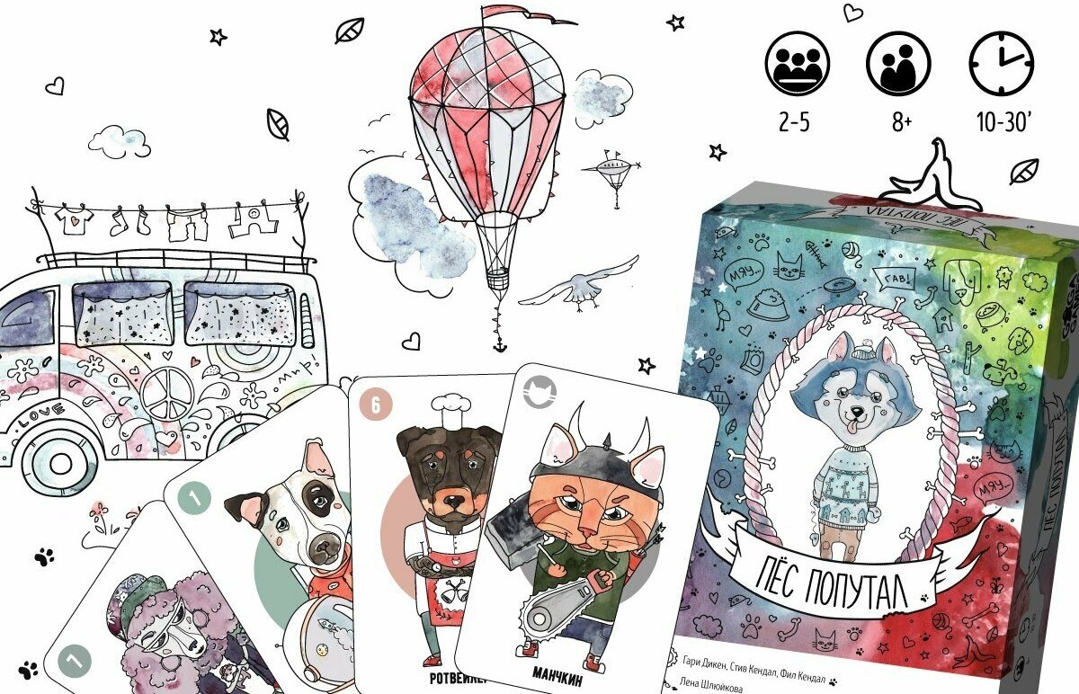 Пес Попутал – одна из самых симпатичных настольных игр, каждая карточка которой была вручную нарисована акварельными красками, а затем оцифрована. Картинки хочется разглядывать снова и снова. Прибавьте компактный размер, простые правила, механику, вызывающую азарт с первой партии – и вот перед вами отличная игра, которая скрасит не один семейный вечер.