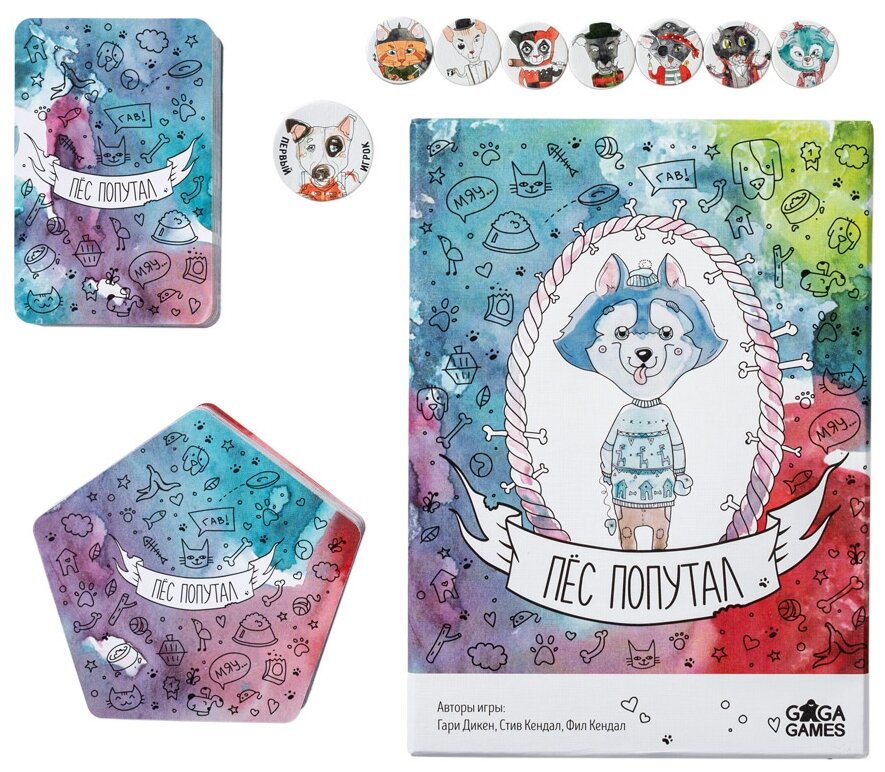 | Комплектация | 50 карт собак, 6 карт чудо-псов, 7 карт кошек 40 карточек предметов, 7 жетонов кошек, правила |