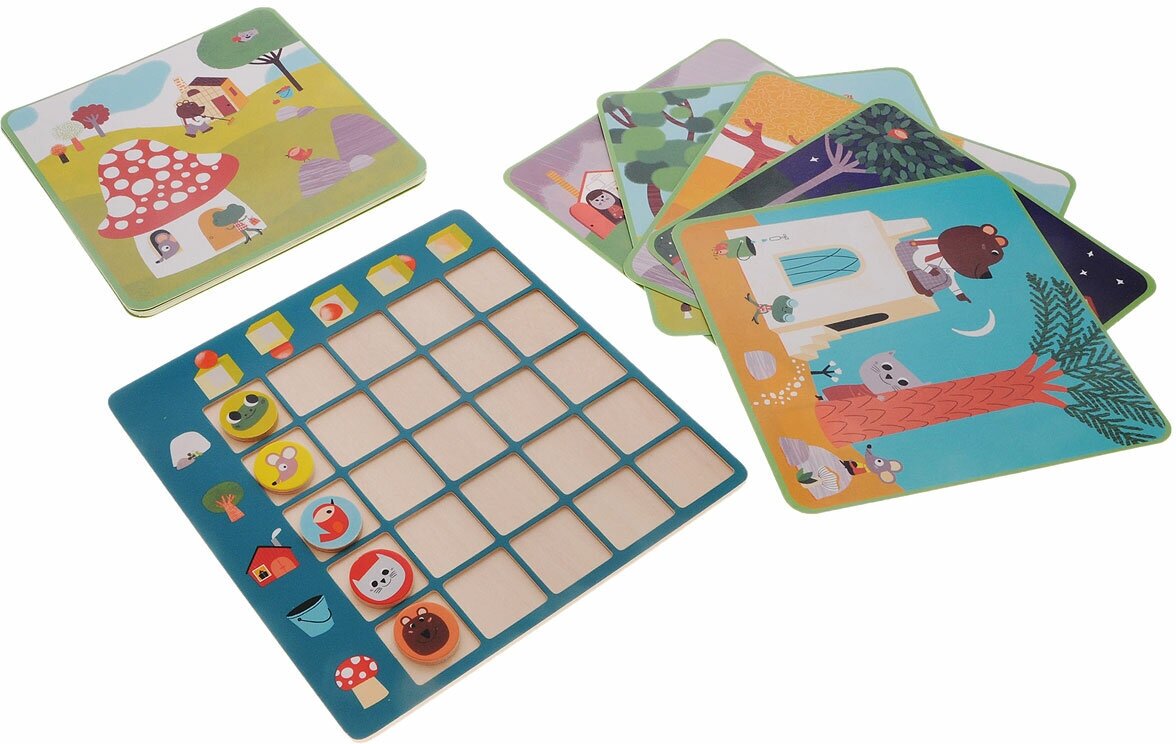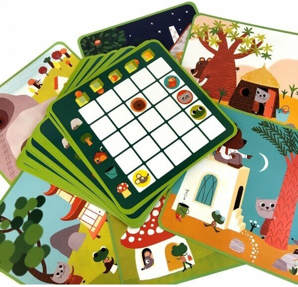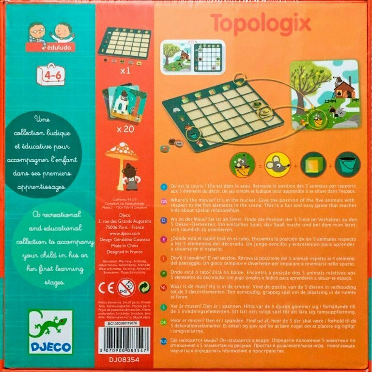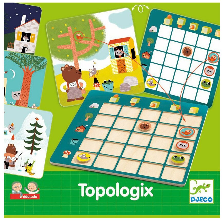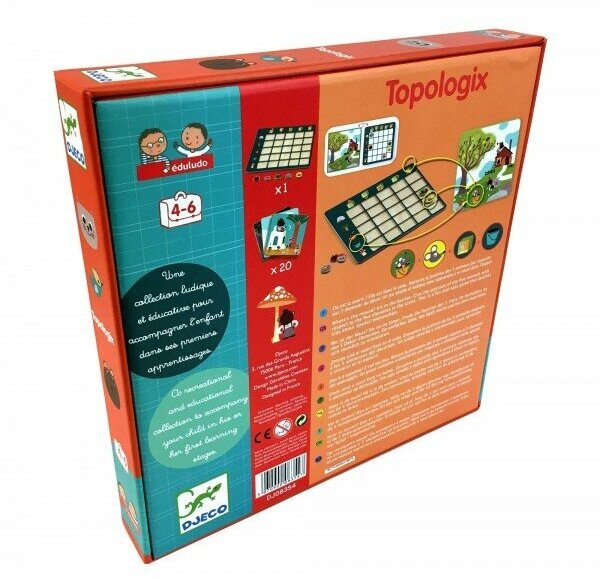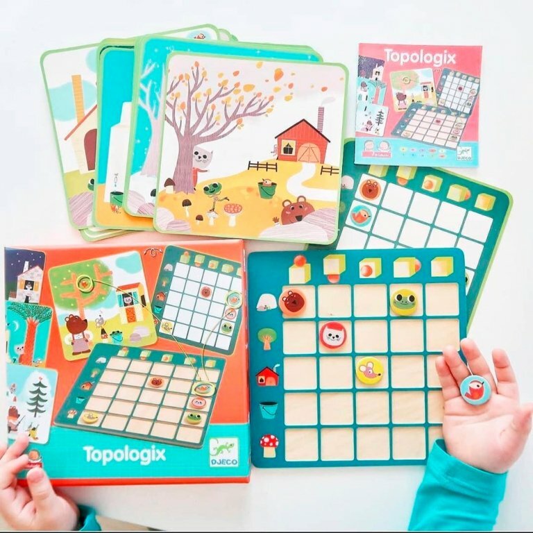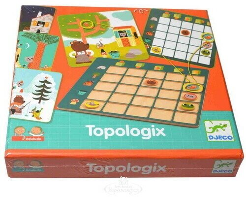Настольная игра Топологик от французского производителя игрушек Djeco – превосходная игра на логику, которая надолго увлечет малыша. В набор входят красочные интересные карточки, а также игровое поле с фишками. На фишках изображены персонажи, которые изображены на карточках. Смысл игры состоит в том, чтобы расположить фишки на игровом поле согласно положению животных на карточке. Малышу будет очень интересно рассматривать яркие забавные изображения на карточках, определять где находятся персонажи и раскладывать фишки на игровом поле.
