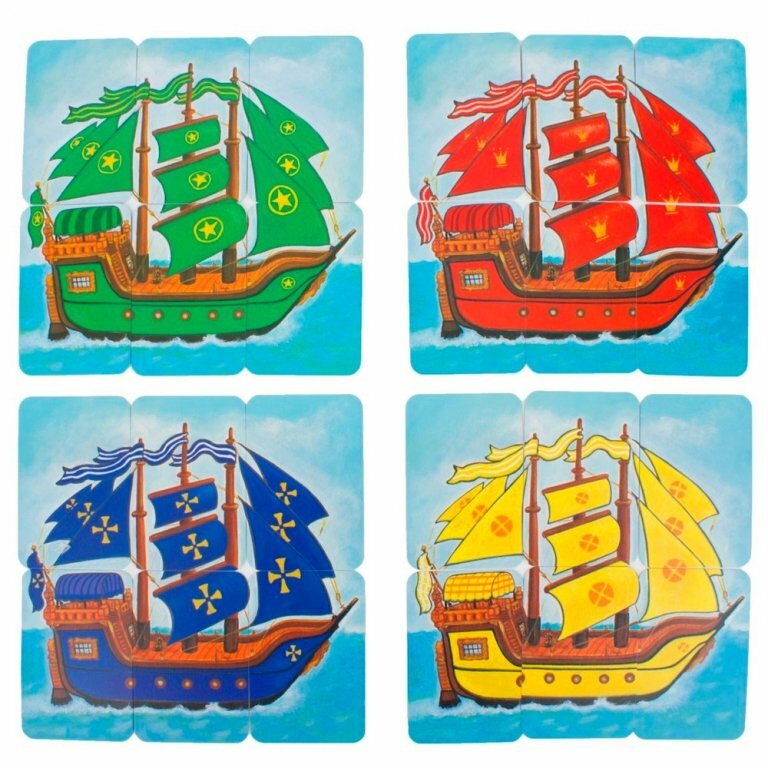 Игроки по очереди вытаскивают карты из общей кучи, не скрывая от соперников. После первого круга каждый участник решает взять еще одну карту из стопки или пропустить ход. Цель игры – первым собрать лодку определенного цвета (6 карт разных частей картинки). Ход игры складывается из стратегии игроков, но каждого может подстерегать злой рок, тогда придется расстаться с заветными картами. В процессе развивается у ребенка прекрасно развивается логическое мышление.