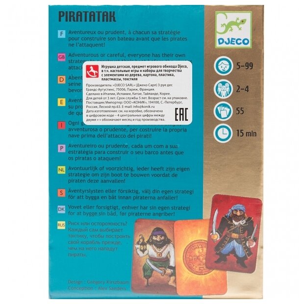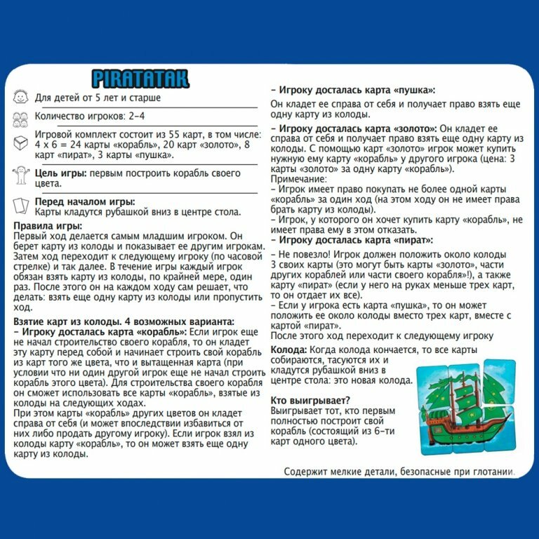 - Игровой комплект состоит из 55 карт (24 карты «Корабль»+20 карт «Золото», 8 карт «Пират», 3 карты «Пушка).