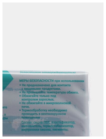 Безопасность: Не предназначено для контакта с пищевыми продуктами. Не превышайте температуру обжига. Обжигайте только под контролем взрослых. Не обжигайте в микроволновой печи и гриле. После обжига пластику Артефакт можно шлифовать, сверлить, резать, клеить, красить и лакировать.