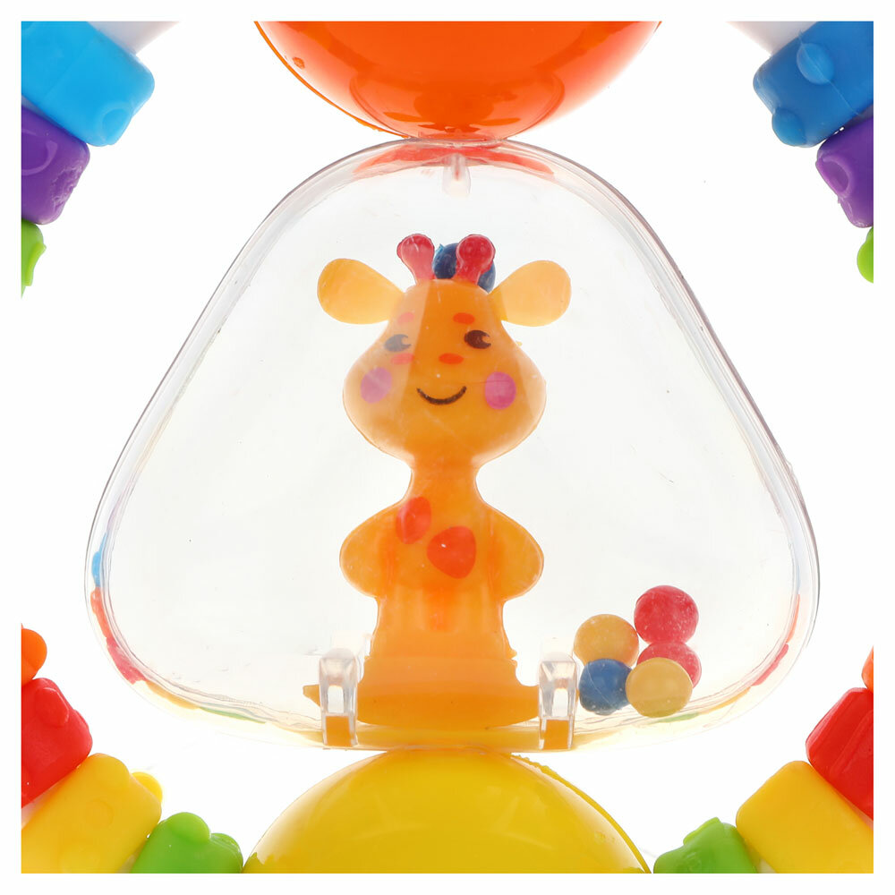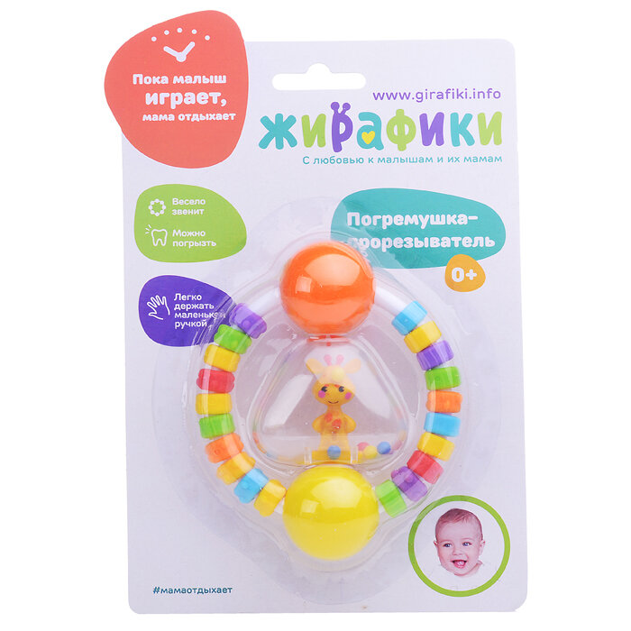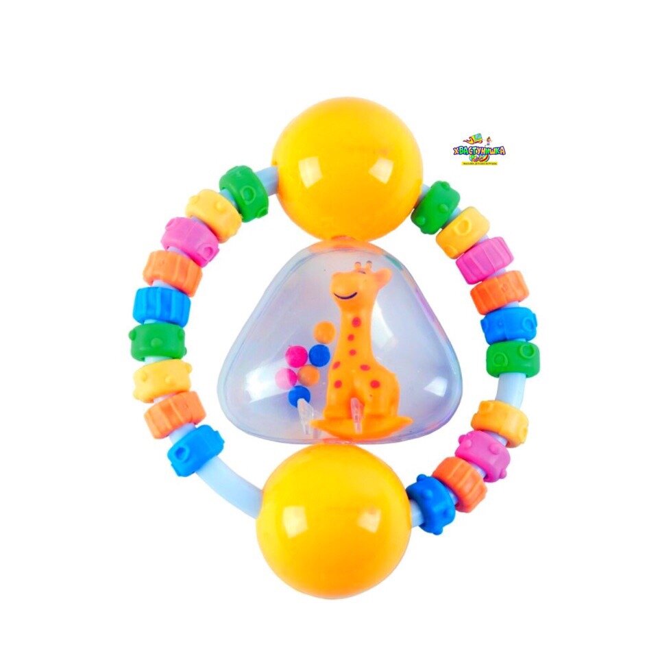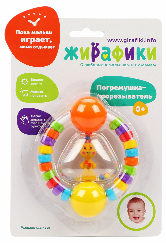 Погремушка в виде колечка состоит из множества развивающих и интересных для малыша элементов. В прозрачной пластиковой "колбе" погремушки — веселый жирафик с разноцветные шарики. Если потрясти погремушкой в воздухе, она будет весело греметь. Фигурные разноцветные бусины на дугах погремушки имеют фактурный рисунок. У всех бусин он разный. Со временем малыш научится двигать бусины по дуге пальчиком.
