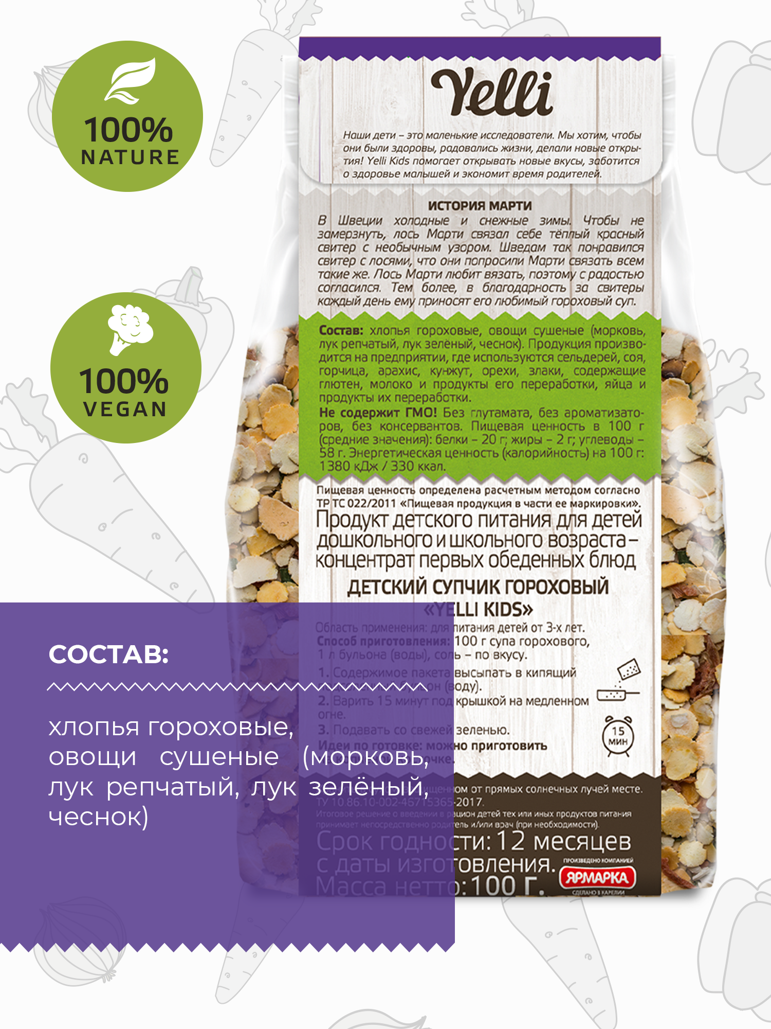 | Состав | хлопья гороховые, овощи сушеные (морковь, лук репчатый, лук зеленый, чеснок). Может содержать следы глютена, сельдерея. Не содержит ГМО |