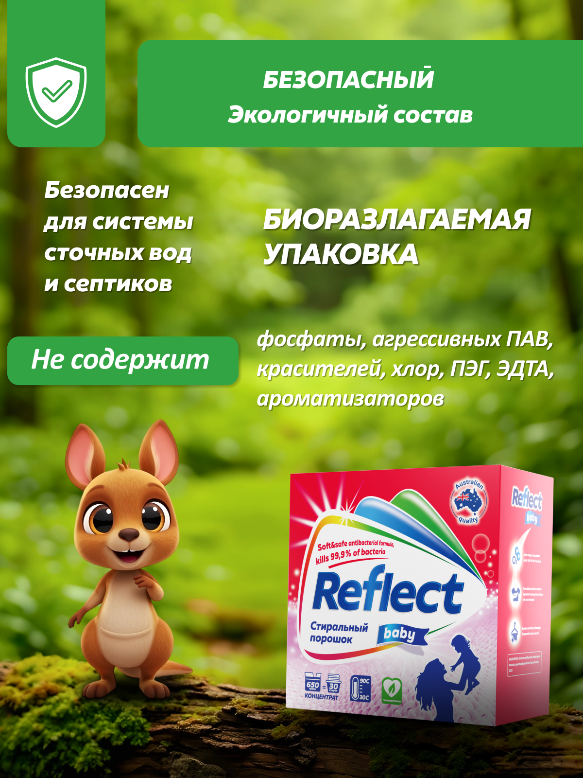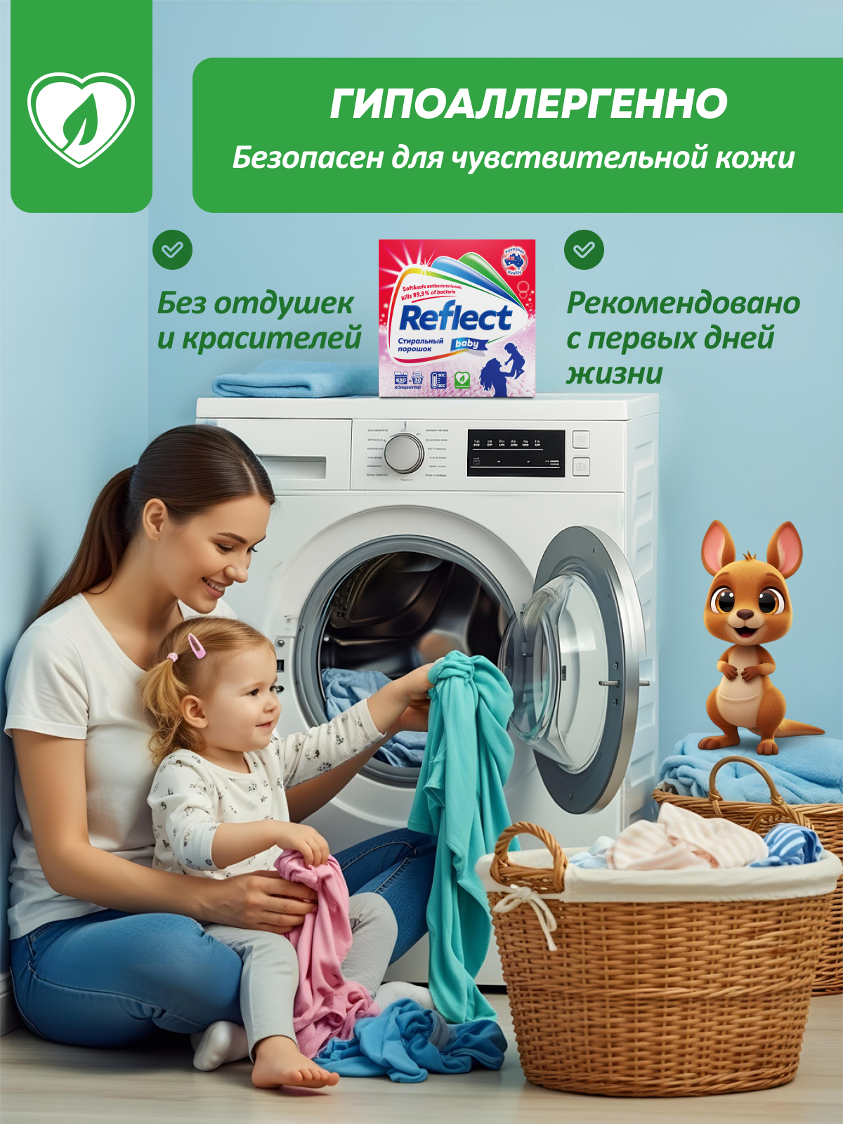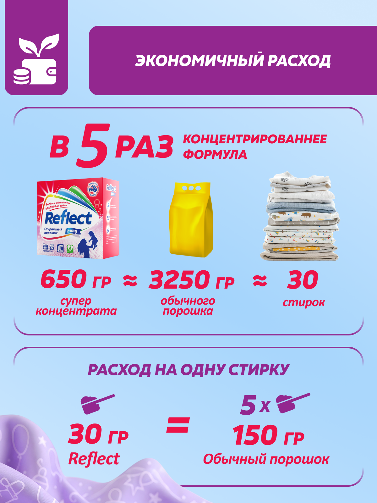 Концентрированный стиральный порошок ""Reflect Baby"" предназначен для стирки детского белья с первых дней жизни ребенка. Изготовленный на основе натурального мыла порошок легко справляется со специфическими загрязнениями от жизнедеятельности ребенка.