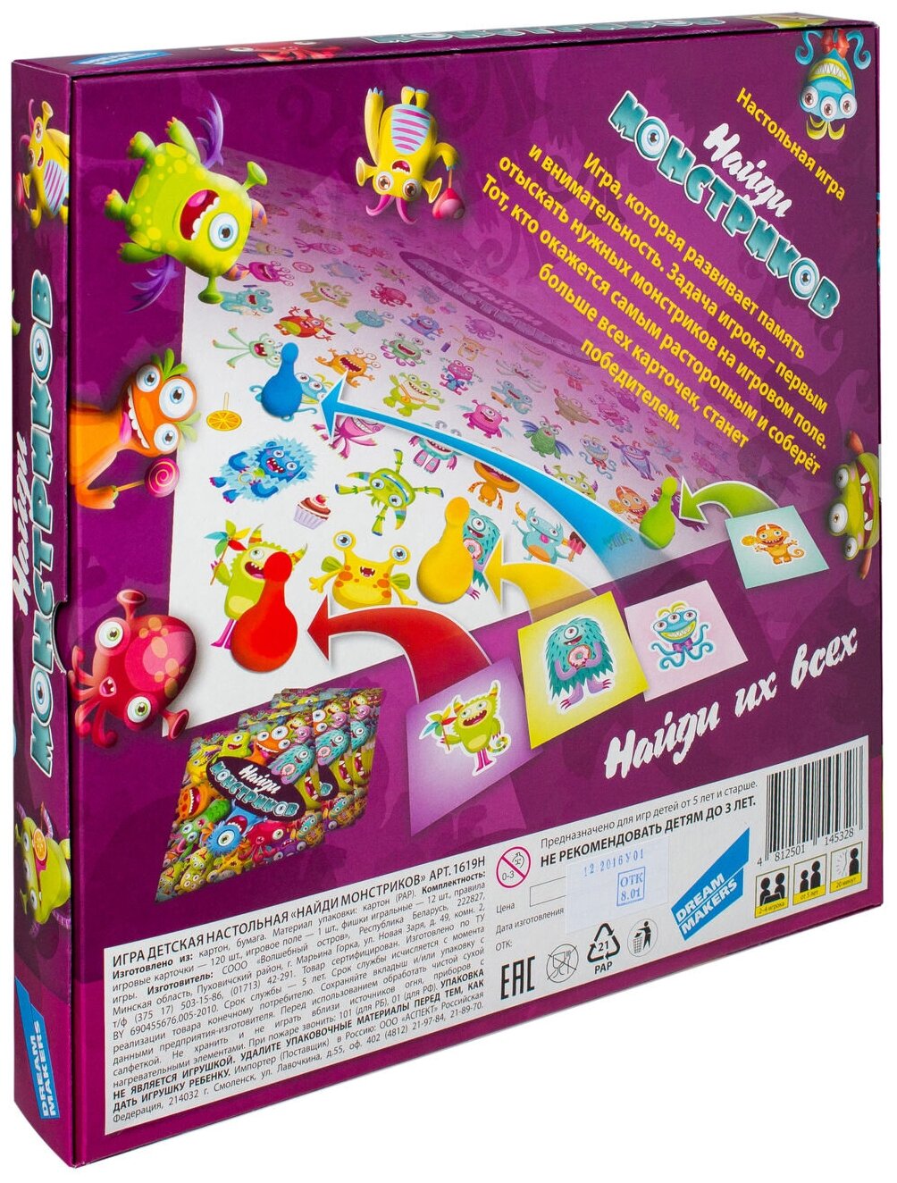 Настольная игра от Dream Makers "Найди монстриков" подойдёт не только деткам, но и взрослым, которые хотят повеселиться. В комплекте 120 карточек с монстрами и 12 фишек. Лучше всего работать с ней, когда четверо людей - получается насыщеннее и быстрее всё. Сами материалы, которые использованы для изготовления достаточно крепкие, карты сделаны абсолютно одинакового размера, инструкция очень понятная и подробная. Считаю, что играть с детьми в 5 лет ещё немного трудновато, но вот возраст 6-7 - отлично уже подходит. Пробовали её и среди деток и с братьями, которым уже не 16 лет - одинаково весело и азартно. Покупала сыновьям по совету как раз-таки брата младшего. Нашла на этом Интернет-ресурсе.