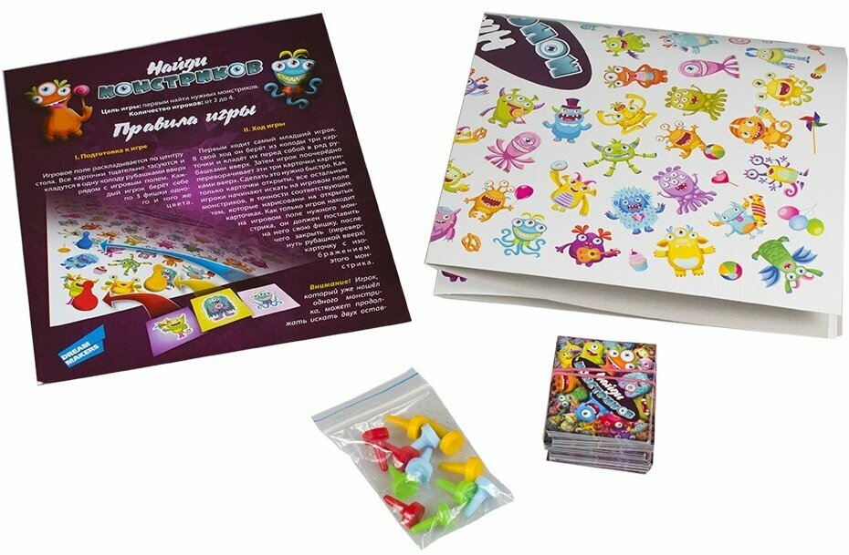 Забавная и логическая настольная игра найди монстриков. Есть поле, 120 карточек и 12 фишок. Захватывает детей надолго, играют по кругу до двух часов. Поле сделано с картона, от частого складывания и раскладывания в центре погнулось и картинка начала протираться. Карточки тоже из картона, уголки погнулись немного, картон не слишком прочный. Придется скоро покупать новую. Развивают моторику рук, мышление, логику.