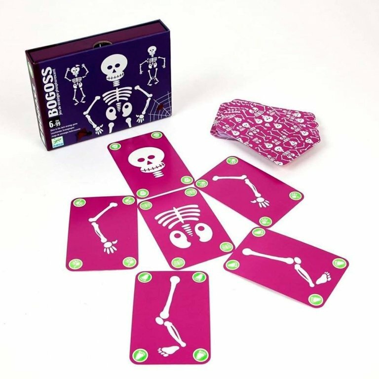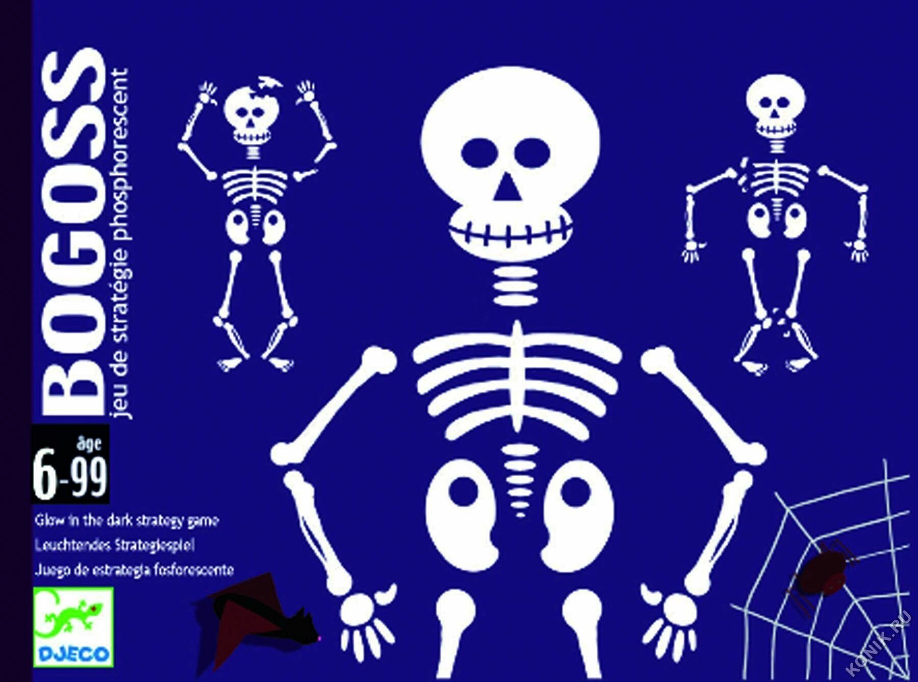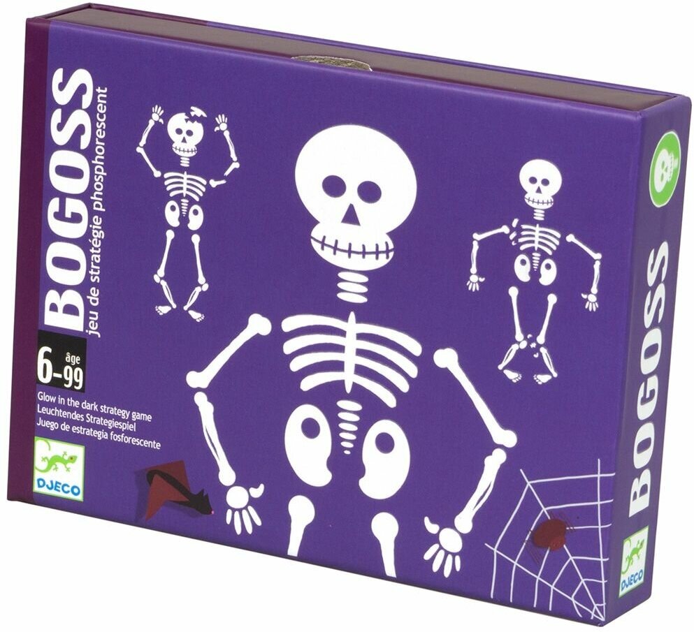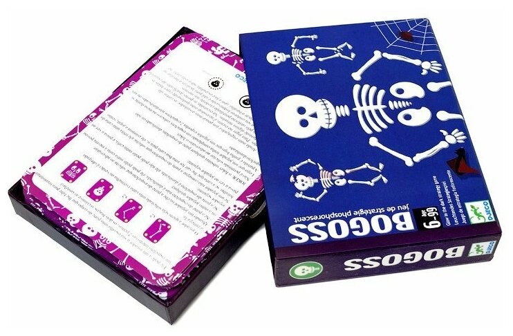 Детская карточная игра Богос от производителя Djeco (Джеко) - необычная карточная игра для детей старше 6 лет. Для победы необходимо собрать два целых или один "сломанный" скелет. Карты светятся в темноте позволяя создать мистический антураж. Можно играть в сумерки. Игра развивает внимательность и позволяет получить начальные знания о физиологии человека.