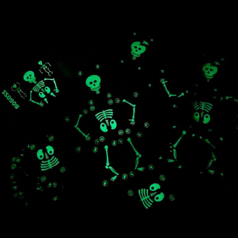 - В наборе 44 фосфоресцентных карт, в том числе: - 30 карт «скелет (с зелеными кружочками), - 12 карт «сломанный скелет (с красными кружочками), - 2 карты «джокер.