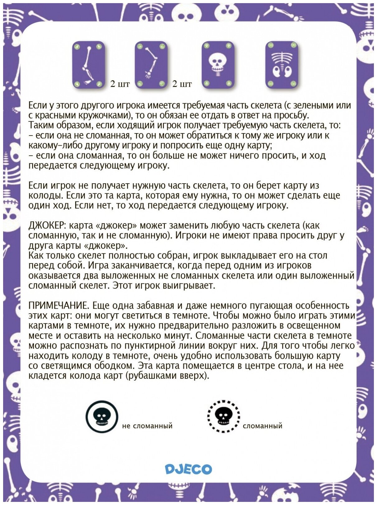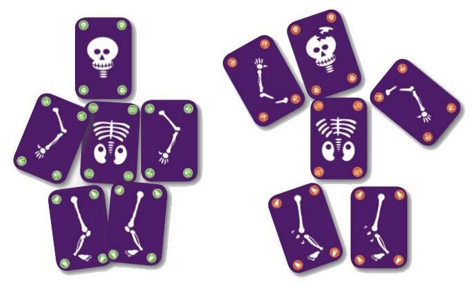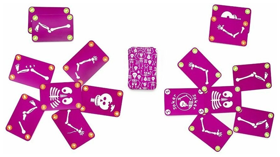 | Состав набора | 44 карты 30 карт скелет (с зелёным кружочком) 12 сломанный скелет (с красным кружочком) и 2 карты джокер |