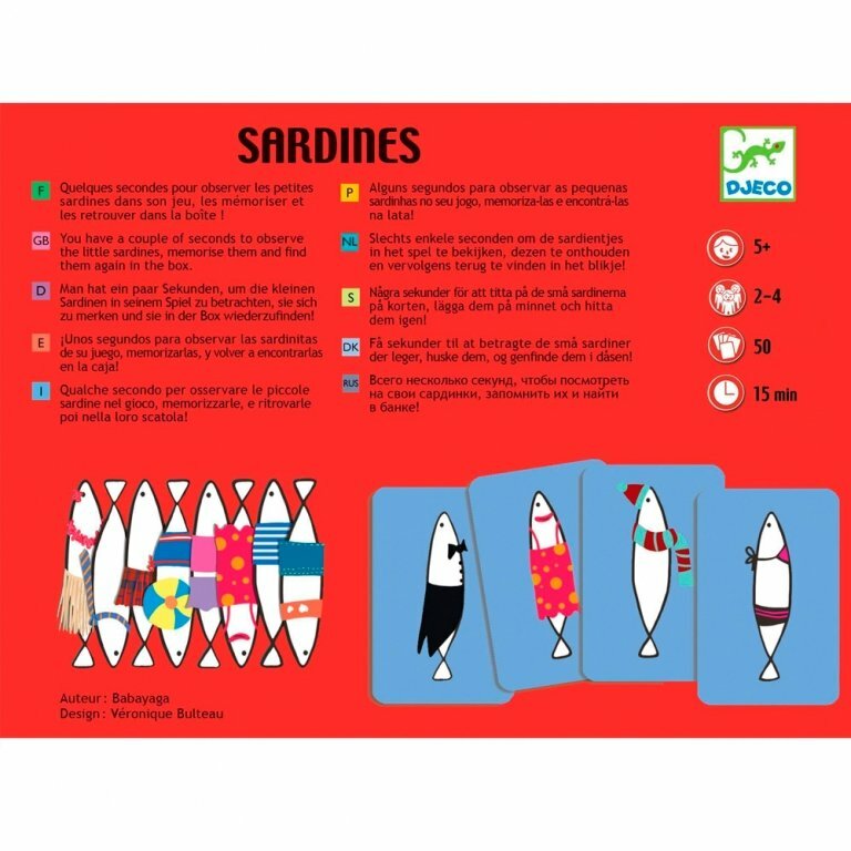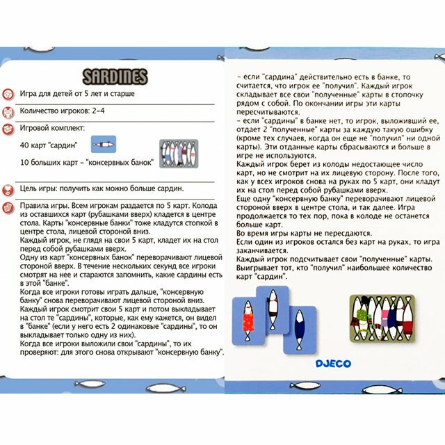 Правила игры: Игроки получают по 5 карт сардины рубашкой вверх не смотря карты, переворачивают на несколько секунд одну большую карту консервная банка и пытаются запомнить все изображённые на ней сардины. Потом смотрят свои карты и выкладывают свои сардины аналогичным в консервной банке. За правильный выбор карта сардина перекладывается в свою стопку, за неверный выбор игрок отдаёт две карты из стопки и они сбрасываются. Выигрывает игрок с наибольшим количеством карт сардина в своей стопке. Игра Сардины прекрасно развивает наблюдательность и внимание ребенка.