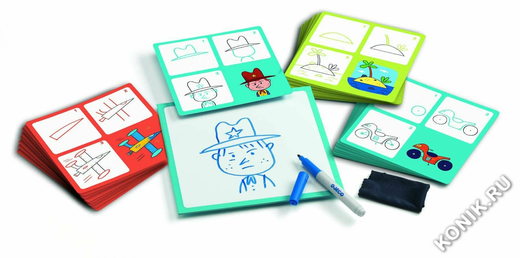 - В наборе: - 24 карточки с уроками, - доска для рисования, - 1 фломастер, - лоскут для стирания изображения.
