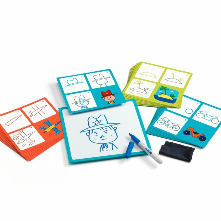В набор входит 24 карточки, на которых поэтапно нарисованы различные изображения: транспорт, домики, человечки и многое другое. В комплекте есть также небольшая доска для рисования и фломастер. Ребенок должен будет воспроизвести изображение на доске согласно карточке с заданием. Небольшой текстильный лоскут позволит стирать изображение с доски и рисовать снова и снова. Набор научит малыша рисовать свои первые картинки, ребенок поймет как переносить изображение, научится работать по инструкции. Набор продается в красивой коробке и идеально подходит для подарка. Все детали изготовлены из высококачественных материалов.