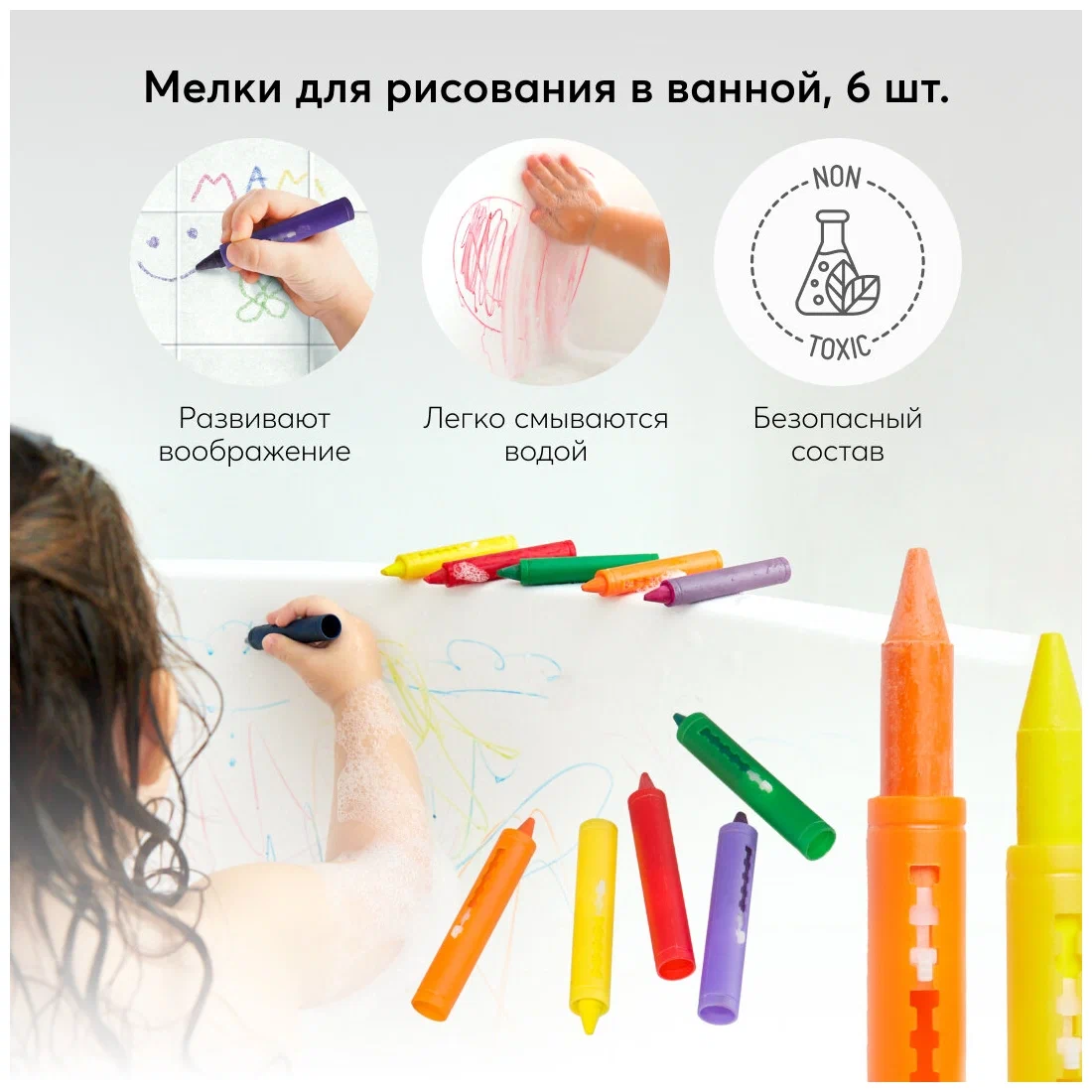 Набор ярких разноцветных мелков для рисования в ванной. Ими можно рисовать на кафеле и самой ванной, создавать нательные рисунки. В наборе 6 мелков красного, оранжевого, желтого, зеленого, синего и фиолетового цветов. Каждый мелок находится в пластиковом корпусе и легко из него выдвигается.